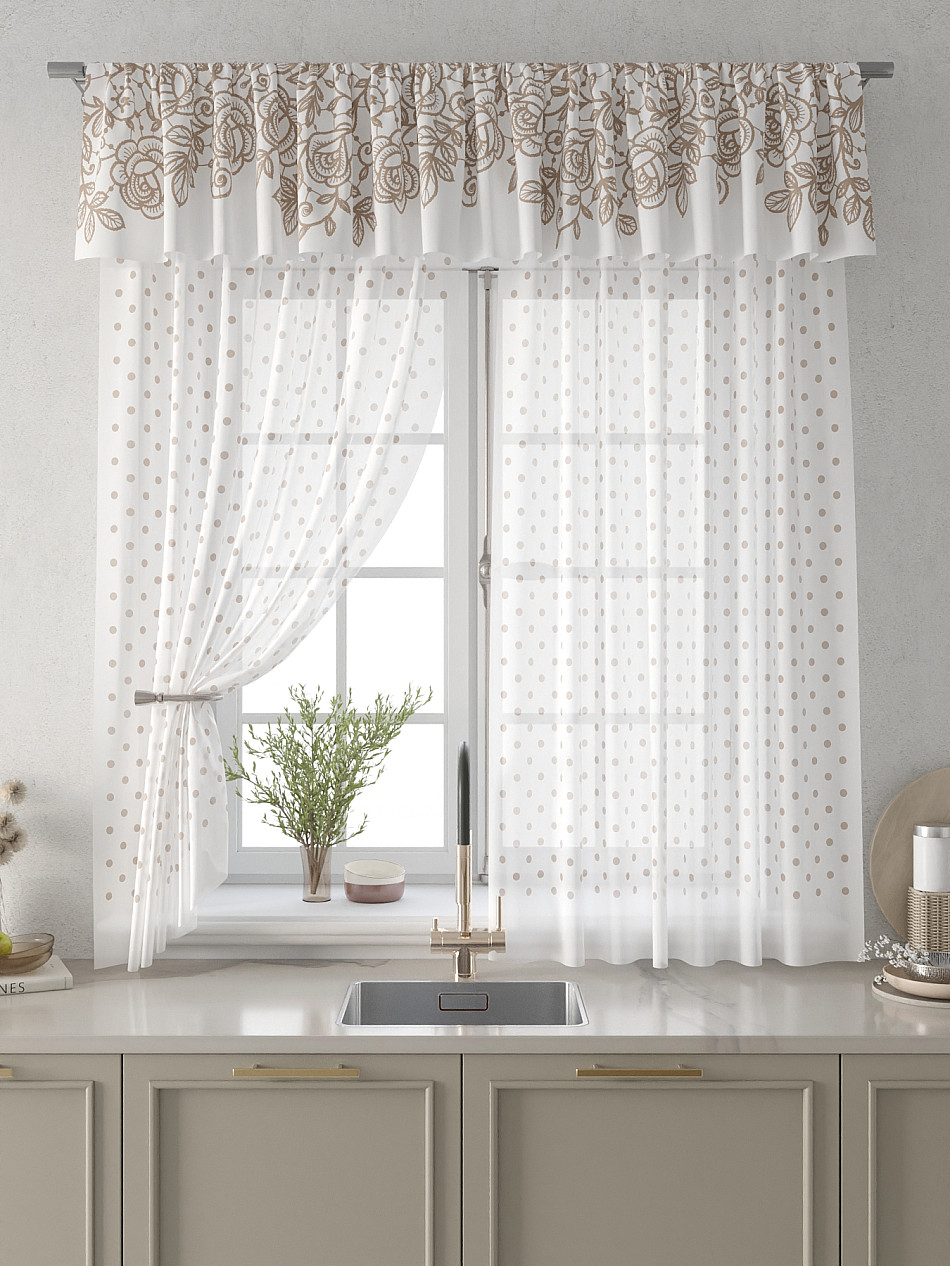 Вуаль 150х160 см. — 2 шт., Ламбрекен 300х40 см. — 1 шт. Комплект штор из вуали оформлены печатным рисунком. Печатный рисунок дает широкие возможности обновить интерьер фактически не требуя ремонта за счет огромного выбора. Ткани с печатным рисунком безопасны и не содержат токсичных веществ. Не смотря на то, что материал легкий, он имеет высокую плотность, мало загрязнятся и не требует особого ухода даже после стирки, что важно для кухонных занавесок. Тюль не выцветает, не растягивается, превосходно драпируются, образуя струящиеся складки. Прекрасное решение для создания красоты и уюта с помощью уникальных дизайнов.