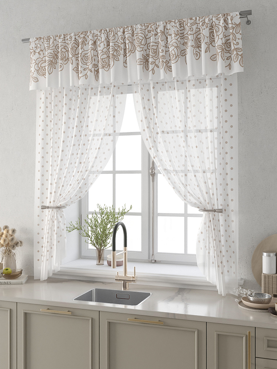 Вуаль 150х180 см. — 2 шт., Ламбрекен 300х40 см. — 1 шт. Комплект штор из вуали оформлены печатным рисунком. Печатный рисунок дает широкие возможности обновить интерьер фактически не требуя ремонта за счет огромного выбора. Ткани с печатным рисунком безопасны и не содержат токсичных веществ. Не смотря на то, что материал легкий, он имеет высокую плотность, мало загрязнятся и не требует особого ухода даже после стирки, что важно для кухонных занавесок. Тюль не выцветает, не растягивается, превосходно драпируются, образуя струящиеся складки. Прекрасное решение для создания красоты и уюта с помощью уникальных дизайнов.