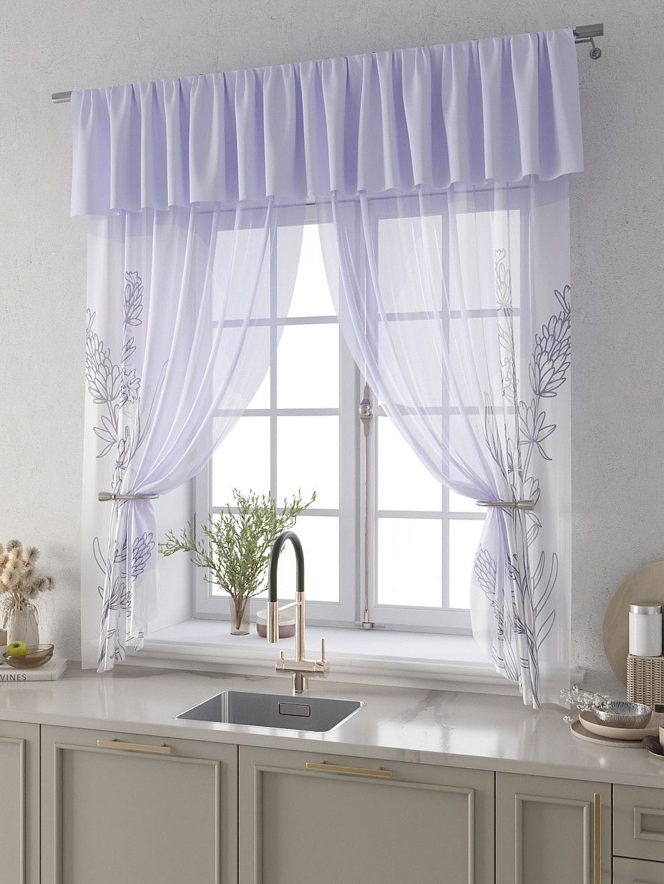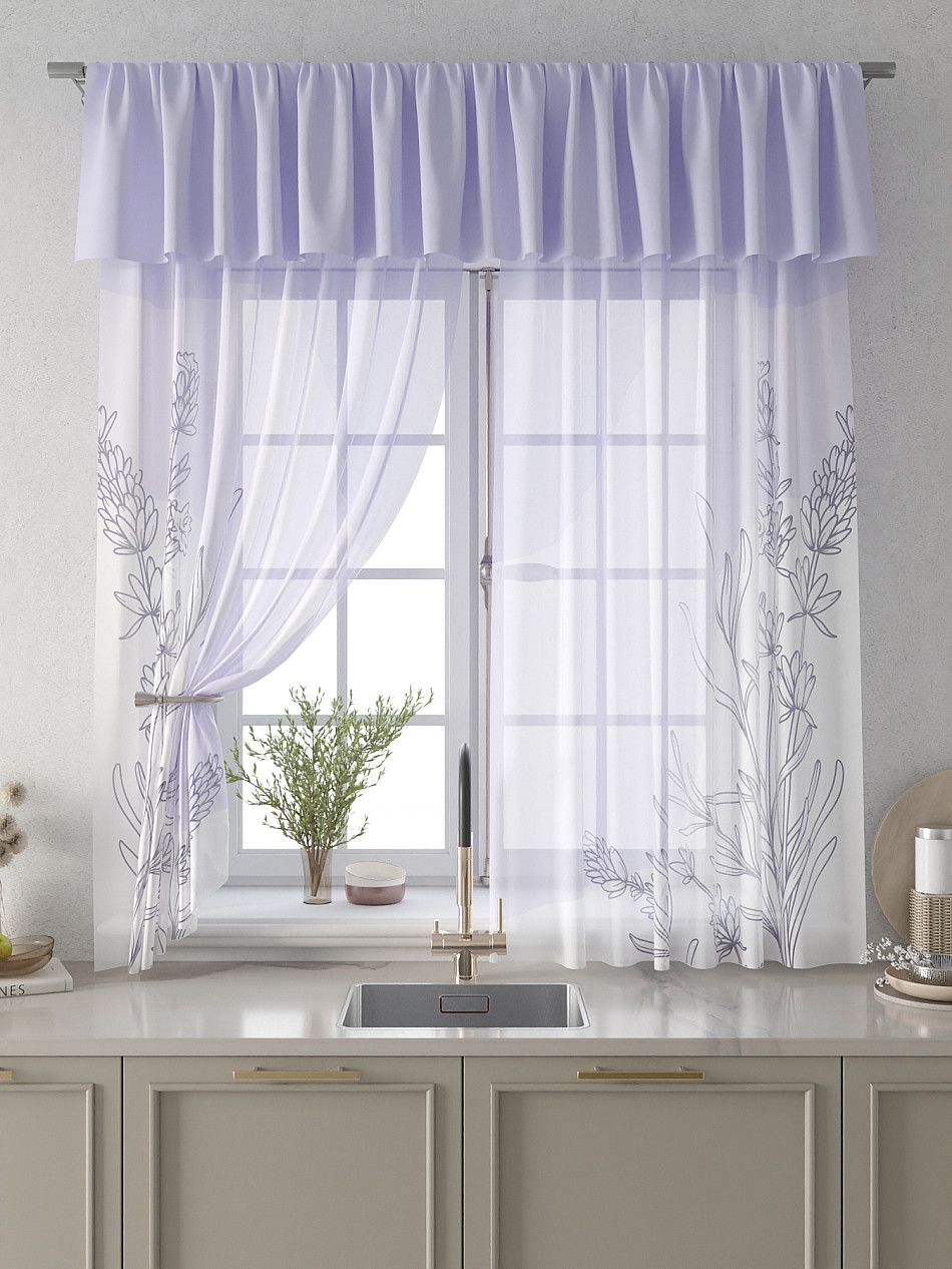Вуаль 150х180 см. — 2 шт., Ламбрекен 300х40 см. — 1 шт. Комплект штор из вуали оформлены печатным рисунком. Печатный рисунок дает широкие возможности обновить интерьер фактически не требуя ремонта за счет огромного выбора. Ткани с печатным рисунком безопасны и не содержат токсичных веществ. Не смотря на то, что материал легкий, он имеет высокую плотность, мало загрязнятся и не требует особого ухода даже после стирки, что важно для кухонных занавесок. Тюль не выцветает, не растягивается, превосходно драпируются, образуя струящиеся складки. Прекрасное решение для создания красоты и уюта с помощью уникальных дизайнов.