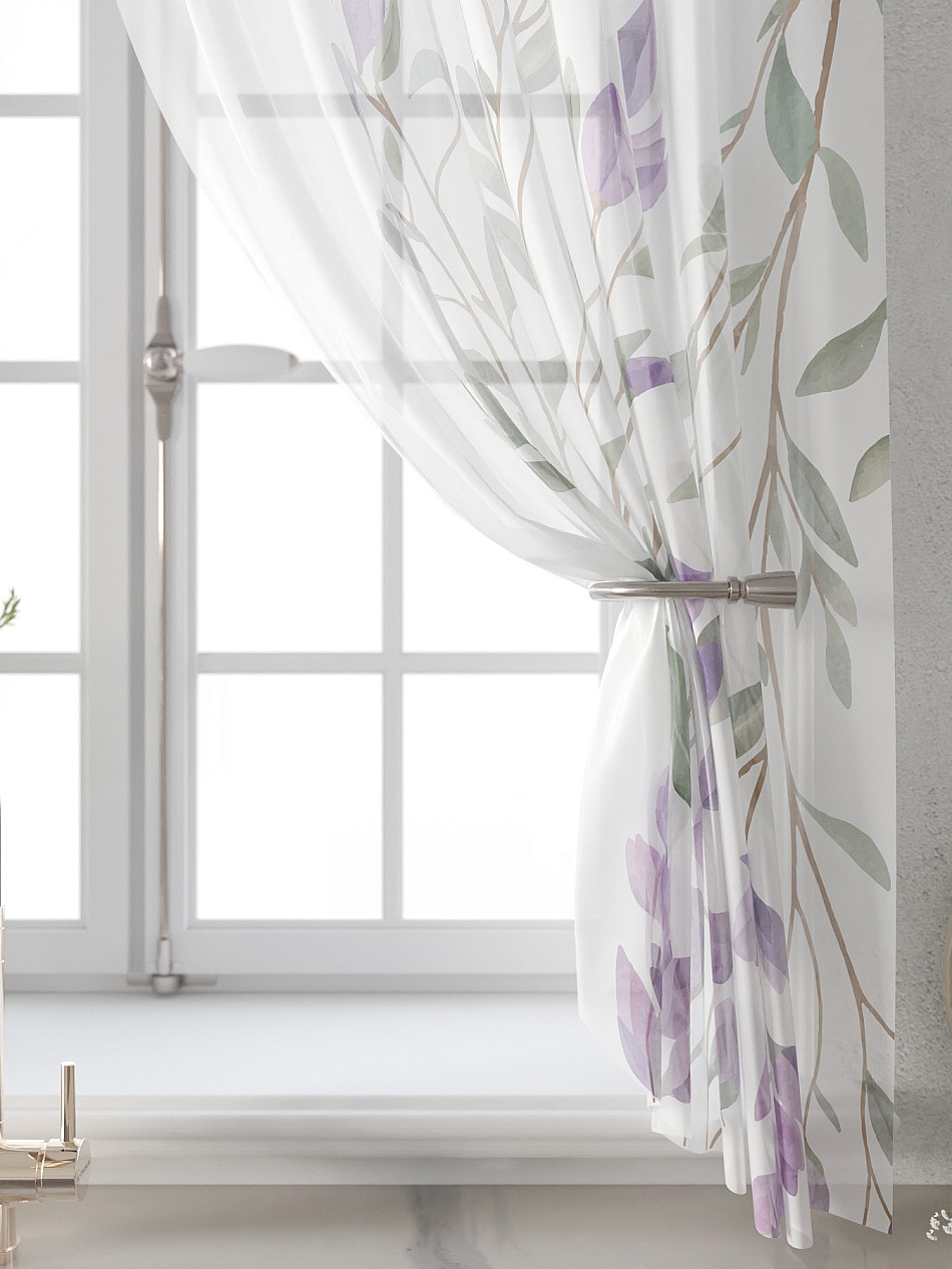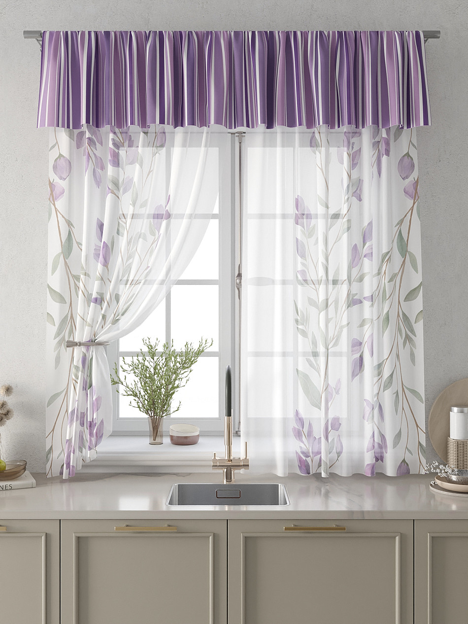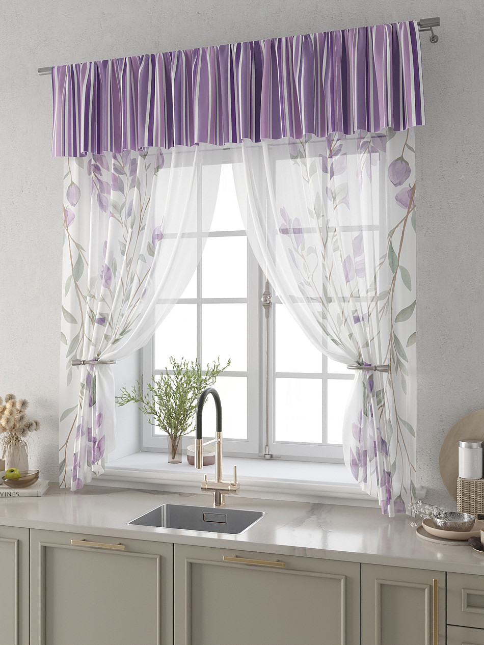 Вуаль 150х180 см. — 2 шт., Ламбрекен 300х40 см. — 1 шт. Комплект штор из вуали оформлены печатным рисунком. Печатный рисунок дает широкие возможности обновить интерьер фактически не требуя ремонта за счет огромного выбора. Ткани с печатным рисунком безопасны и не содержат токсичных веществ. Не смотря на то, что материал легкий, он имеет высокую плотность, мало загрязнятся и не требует особого ухода даже после стирки, что важно для кухонных занавесок. Тюль не выцветает, не растягивается, превосходно драпируются, образуя струящиеся складки. Прекрасное решение для создания красоты и уюта с помощью уникальных дизайнов.