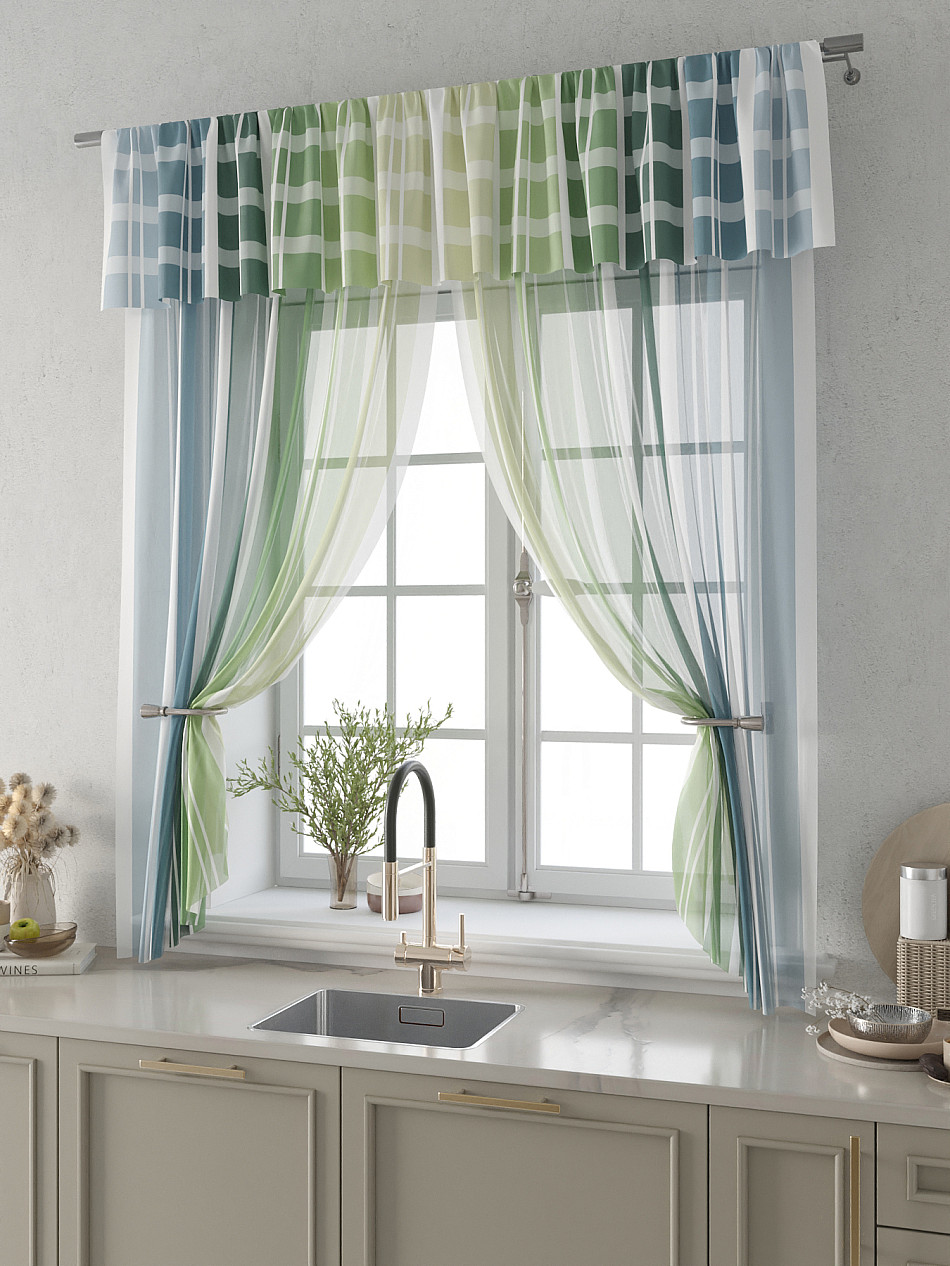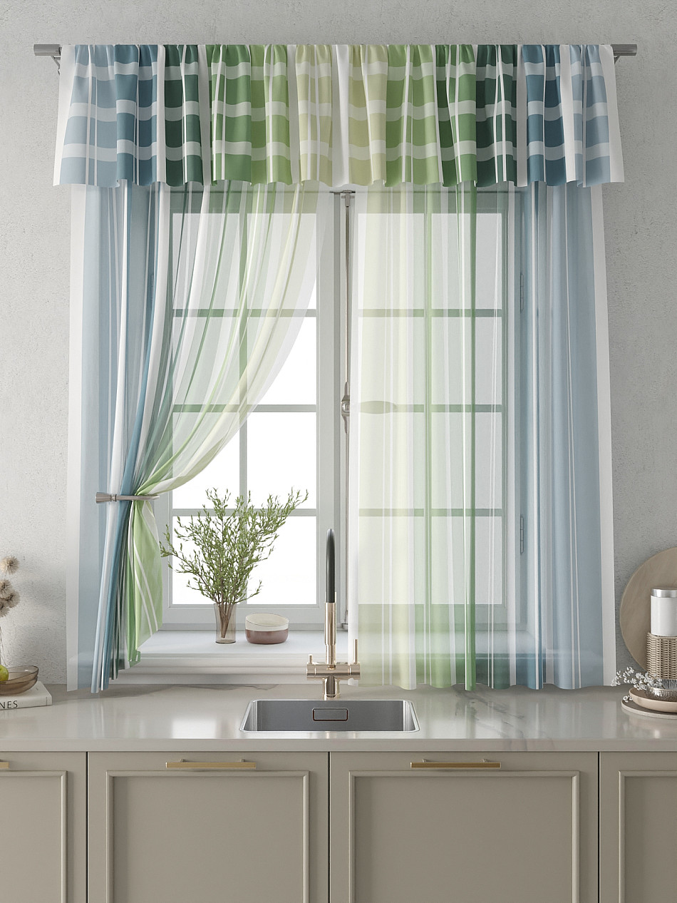 Вуаль 150х180 см. — 2 шт., Ламбрекен 300х40 см. — 1 шт. Комплект штор из вуали оформлены печатным рисунком. Печатный рисунок дает широкие возможности обновить интерьер фактически не требуя ремонта за счет огромного выбора. Ткани с печатным рисунком безопасны и не содержат токсичных веществ. Не смотря на то, что материал легкий, он имеет высокую плотность, мало загрязнятся и не требует особого ухода даже после стирки, что важно для кухонных занавесок. Тюль не выцветает, не растягивается, превосходно драпируются, образуя струящиеся складки. Прекрасное решение для создания красоты и уюта с помощью уникальных дизайнов.