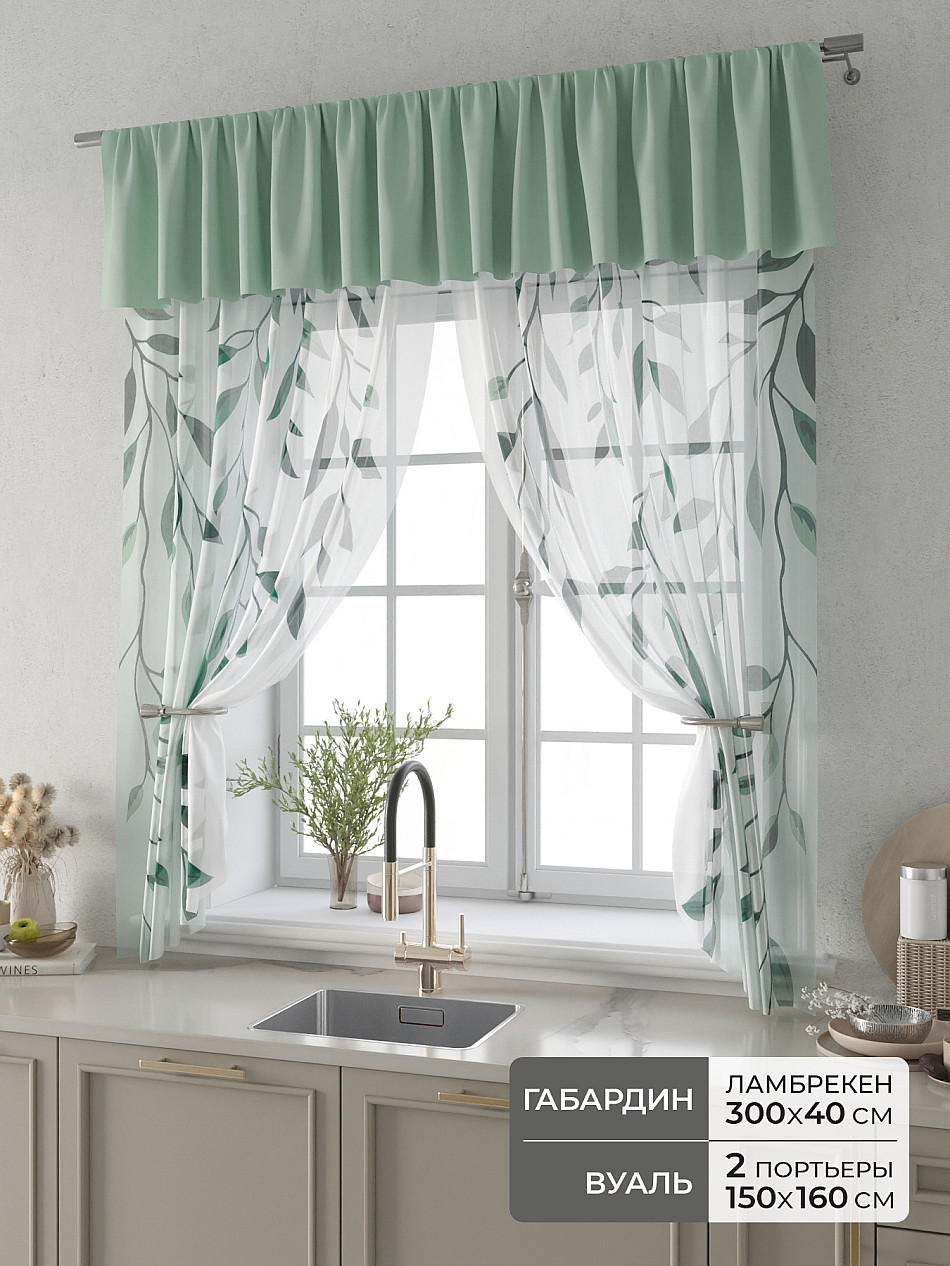 Вуаль 150х160 см — 2 шт., Ламбрекен 300х40 см — 1 шт. ( Изменить высоту) Крепление: шторная лента (крючки), кулиска Подробнее