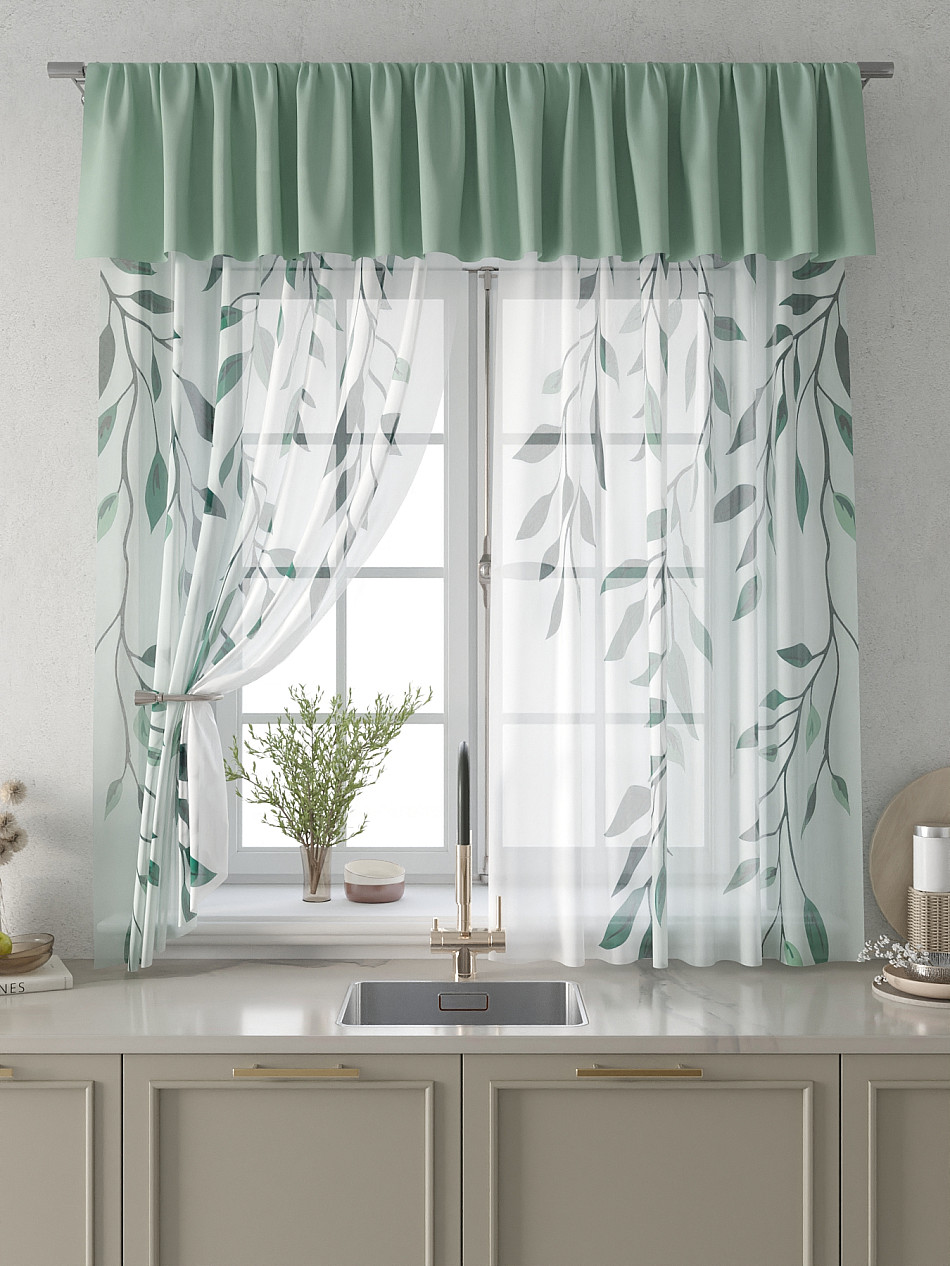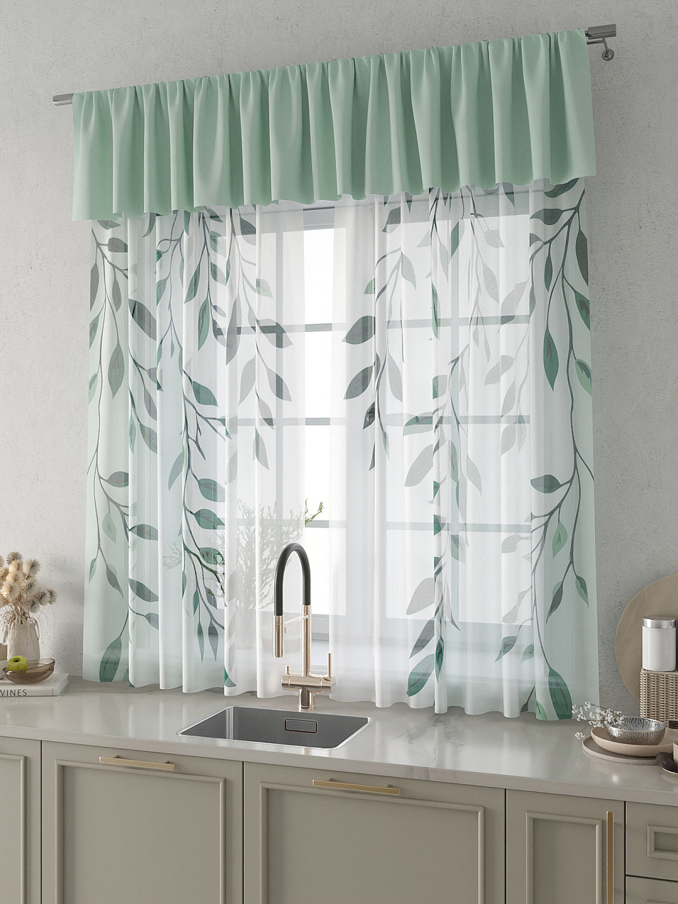 Вуаль 150х160 см. — 2 шт., Ламбрекен 300х40 см. — 1 шт. Комплект штор из вуали оформлены печатным рисунком. Печатный рисунок дает широкие возможности обновить интерьер фактически не требуя ремонта за счет огромного выбора. Ткани с печатным рисунком безопасны и не содержат токсичных веществ. Не смотря на то, что материал легкий, он имеет высокую плотность, мало загрязнятся и не требует особого ухода даже после стирки, что важно для кухонных занавесок. Тюль не выцветает, не растягивается, превосходно драпируются, образуя струящиеся складки. Прекрасное решение для создания красоты и уюта с помощью уникальных дизайнов.
