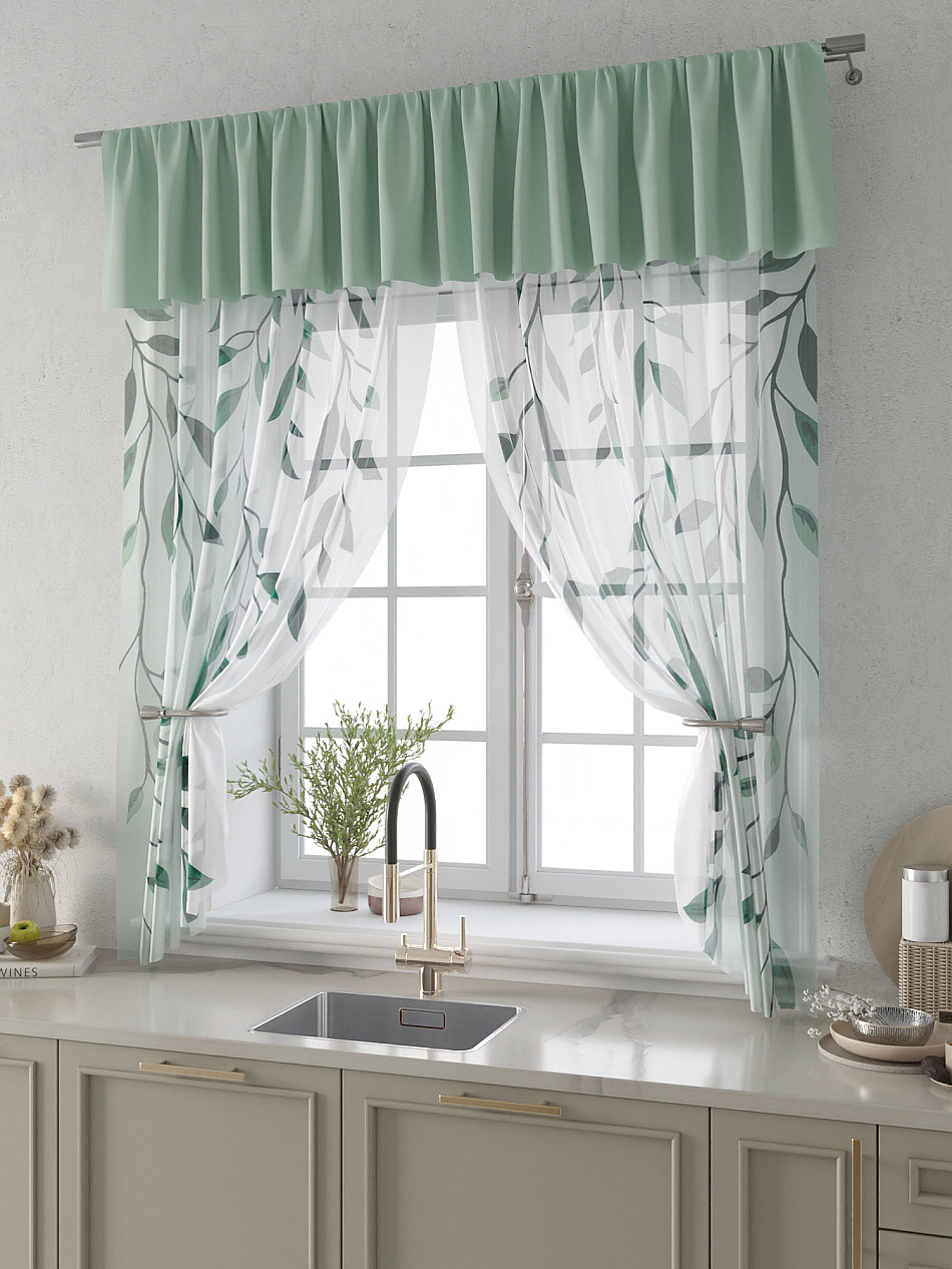 Вуаль 150х180 см. — 2 шт., Ламбрекен 300х40 см. — 1 шт. Комплект штор из вуали оформлены печатным рисунком. Печатный рисунок дает широкие возможности обновить интерьер фактически не требуя ремонта за счет огромного выбора. Ткани с печатным рисунком безопасны и не содержат токсичных веществ. Не смотря на то, что материал легкий, он имеет высокую плотность, мало загрязнятся и не требует особого ухода даже после стирки, что важно для кухонных занавесок. Тюль не выцветает, не растягивается, превосходно драпируются, образуя струящиеся складки. Прекрасное решение для создания красоты и уюта с помощью уникальных дизайнов.
