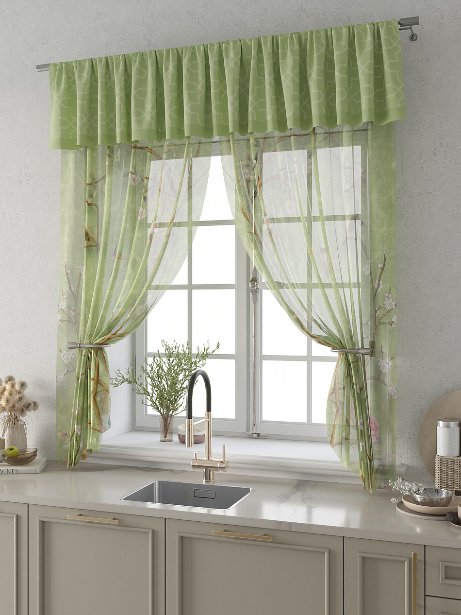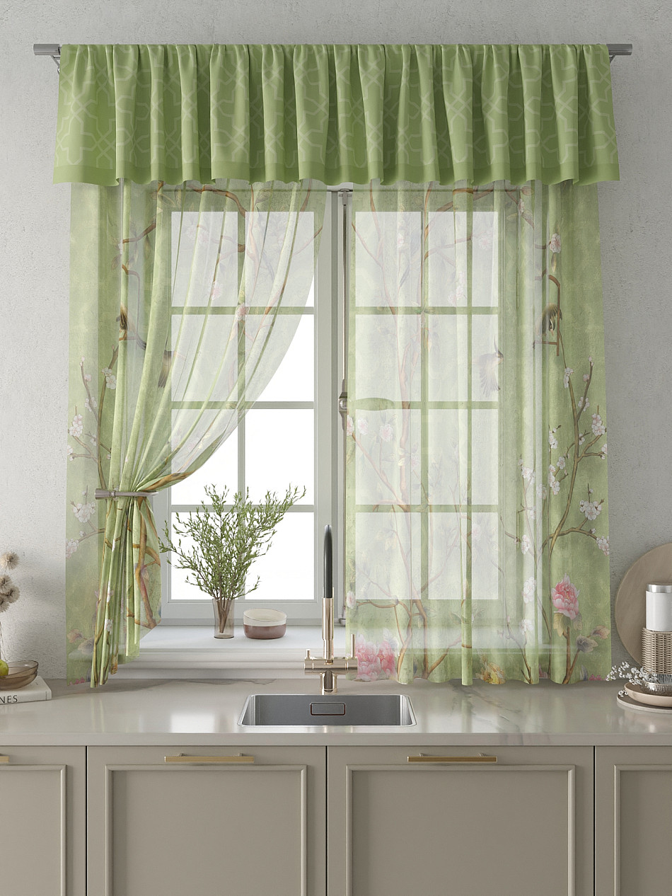 Вуаль 150х180 см. — 2 шт., Ламбрекен 300х40 см. — 1 шт. Комплект штор из вуали оформлены печатным рисунком. Печатный рисунок дает широкие возможности обновить интерьер фактически не требуя ремонта за счет огромного выбора. Ткани с печатным рисунком безопасны и не содержат токсичных веществ. Не смотря на то, что материал легкий, он имеет высокую плотность, мало загрязнятся и не требует особого ухода даже после стирки, что важно для кухонных занавесок. Тюль не выцветает, не растягивается, превосходно драпируются, образуя струящиеся складки. Прекрасное решение для создания красоты и уюта с помощью уникальных дизайнов.