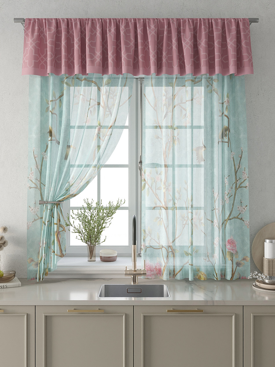 Вуаль 150х160 см. — 2 шт., Ламбрекен 300х40 см. — 1 шт. Комплект штор из вуали оформлены печатным рисунком. Печатный рисунок дает широкие возможности обновить интерьер фактически не требуя ремонта за счет огромного выбора. Ткани с печатным рисунком безопасны и не содержат токсичных веществ. Не смотря на то, что материал легкий, он имеет высокую плотность, мало загрязнятся и не требует особого ухода даже после стирки, что важно для кухонных занавесок. Тюль не выцветает, не растягивается, превосходно драпируются, образуя струящиеся складки. Прекрасное решение для создания красоты и уюта с помощью уникальных дизайнов.