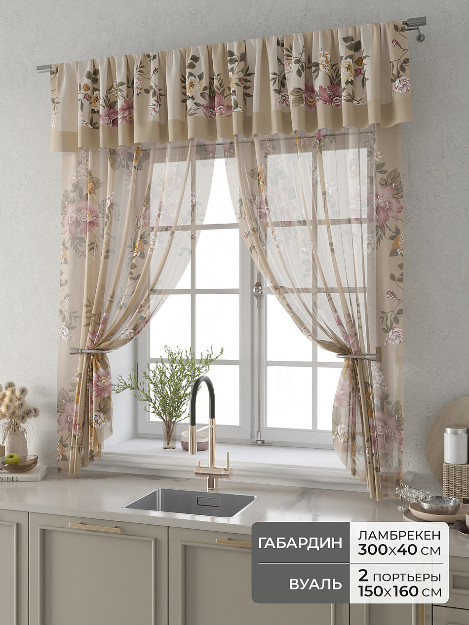 Вуаль 150х160 см — 2 шт., Ламбрекен 300х40 см — 1 шт. ( Изменить высоту) Крепление: шторная лента (крючки), кулиска Подробнее