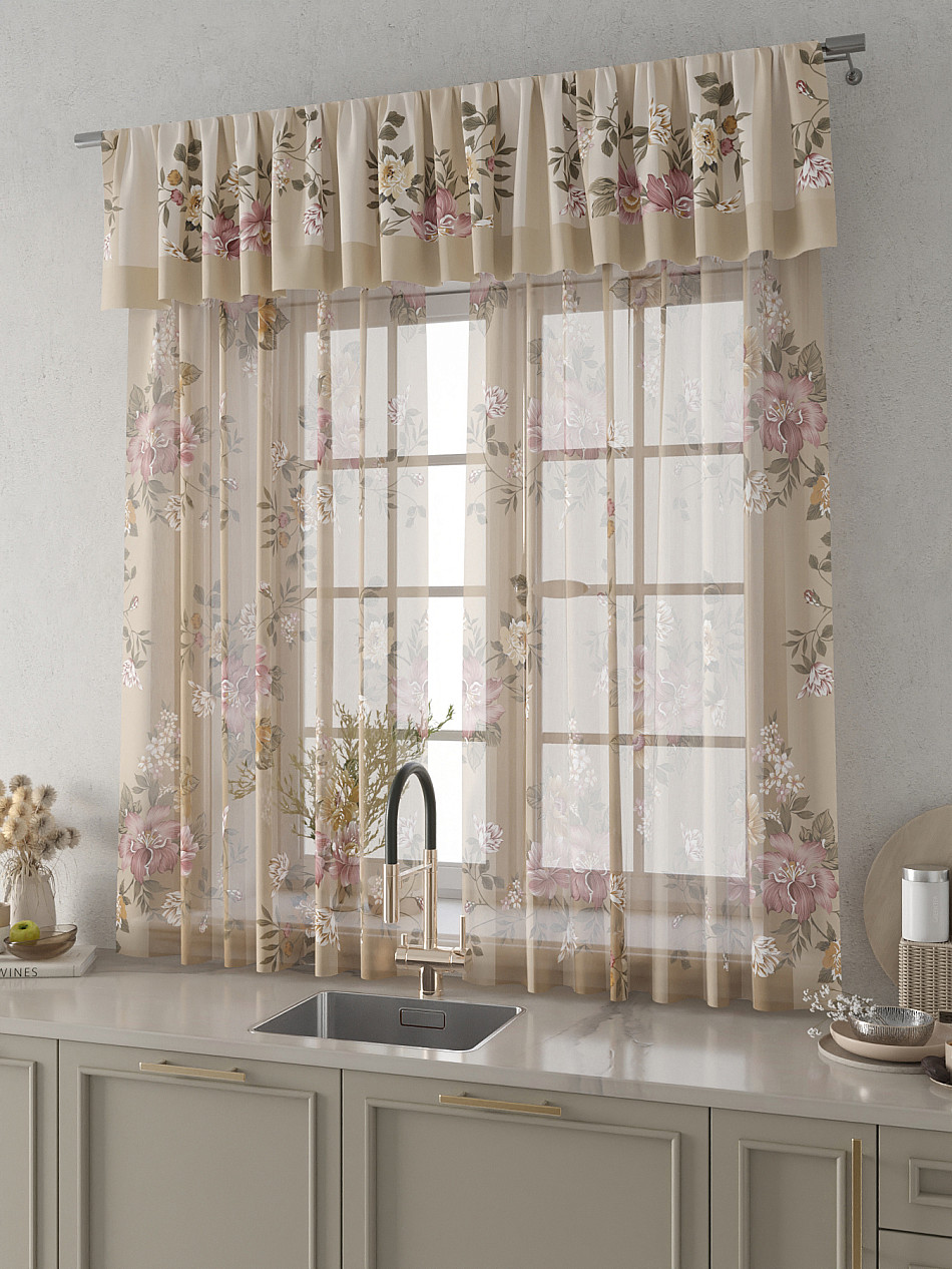 Вуаль 150х160 см. — 2 шт., Ламбрекен 300х40 см. — 1 шт. Комплект штор из вуали оформлены печатным рисунком. Печатный рисунок дает широкие возможности обновить интерьер фактически не требуя ремонта за счет огромного выбора. Ткани с печатным рисунком безопасны и не содержат токсичных веществ. Не смотря на то, что материал легкий, он имеет высокую плотность, мало загрязнятся и не требует особого ухода даже после стирки, что важно для кухонных занавесок. Тюль не выцветает, не растягивается, превосходно драпируются, образуя струящиеся складки. Прекрасное решение для создания красоты и уюта с помощью уникальных дизайнов.