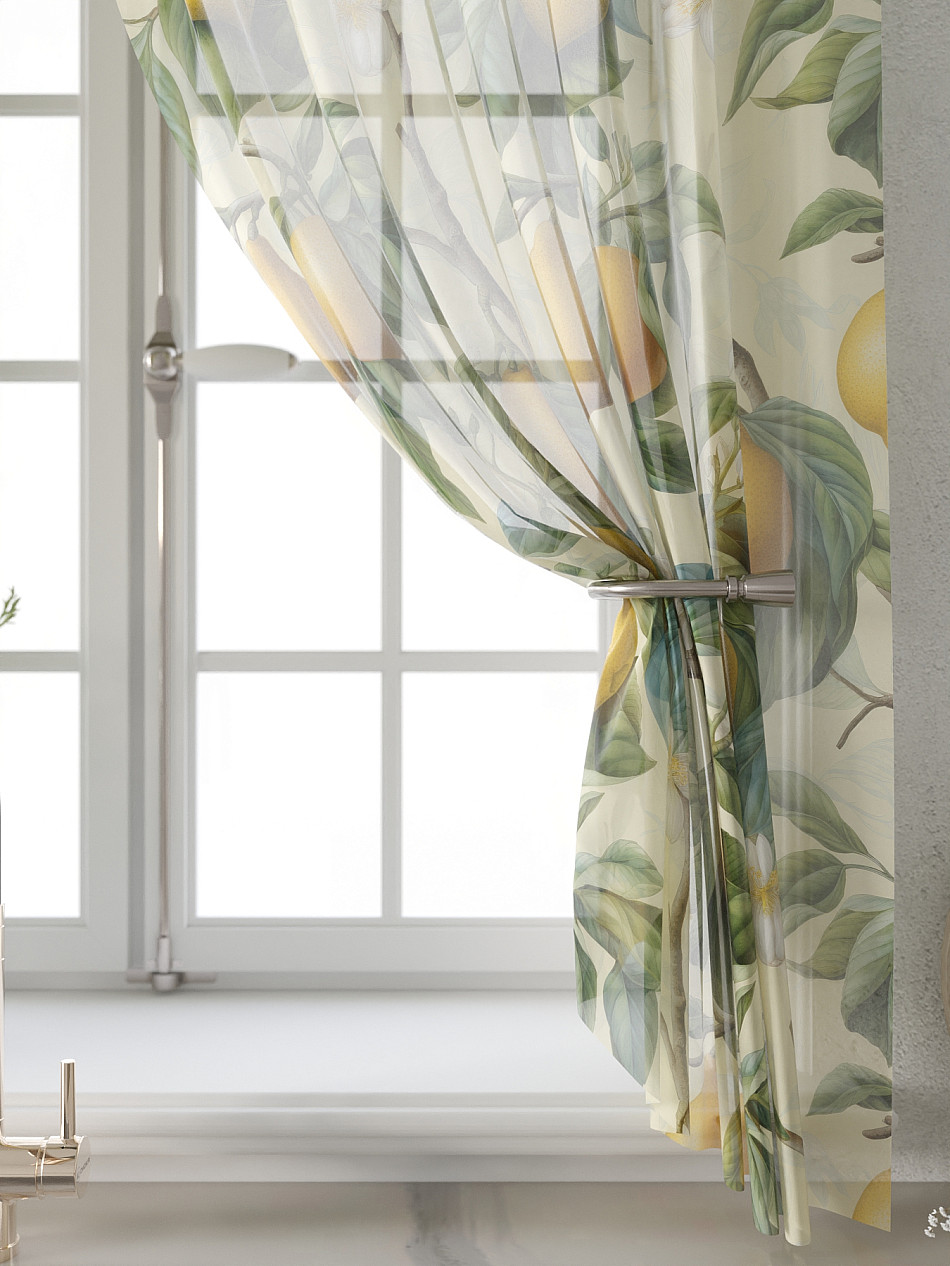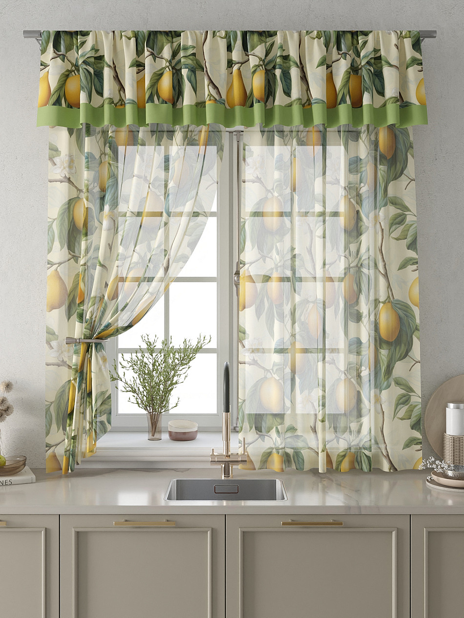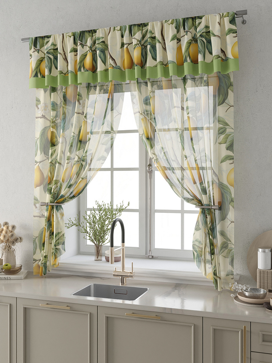 Вуаль 150х180 см. — 2 шт., Ламбрекен 300х40 см. — 1 шт. Комплект штор из вуали оформлены печатным рисунком. Печатный рисунок дает широкие возможности обновить интерьер фактически не требуя ремонта за счет огромного выбора. Ткани с печатным рисунком безопасны и не содержат токсичных веществ. Не смотря на то, что материал легкий, он имеет высокую плотность, мало загрязнятся и не требует особого ухода даже после стирки, что важно для кухонных занавесок. Тюль не выцветает, не растягивается, превосходно драпируются, образуя струящиеся складки. Прекрасное решение для создания красоты и уюта с помощью уникальных дизайнов.