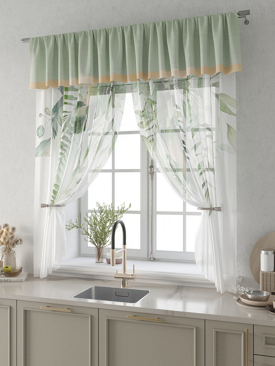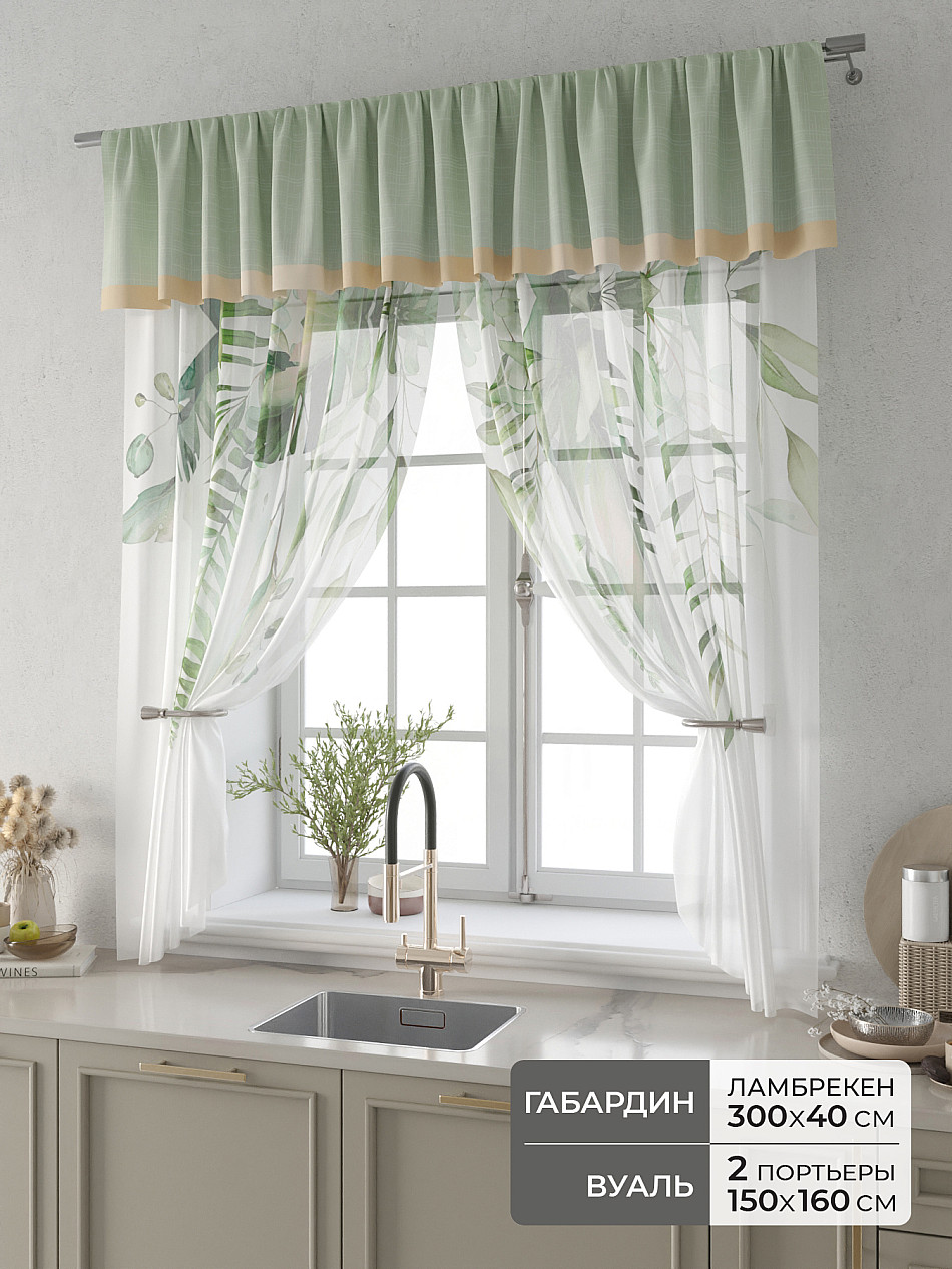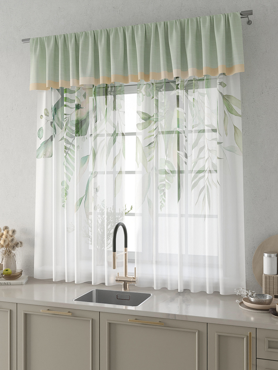 Вуаль 150х160 см. — 2 шт., Ламбрекен 300х40 см. — 1 шт. Комплект штор из вуали оформлены печатным рисунком. Печатный рисунок дает широкие возможности обновить интерьер фактически не требуя ремонта за счет огромного выбора. Ткани с печатным рисунком безопасны и не содержат токсичных веществ. Не смотря на то, что материал легкий, он имеет высокую плотность, мало загрязнятся и не требует особого ухода даже после стирки, что важно для кухонных занавесок. Тюль не выцветает, не растягивается, превосходно драпируются, образуя струящиеся складки. Прекрасное решение для создания красоты и уюта с помощью уникальных дизайнов.