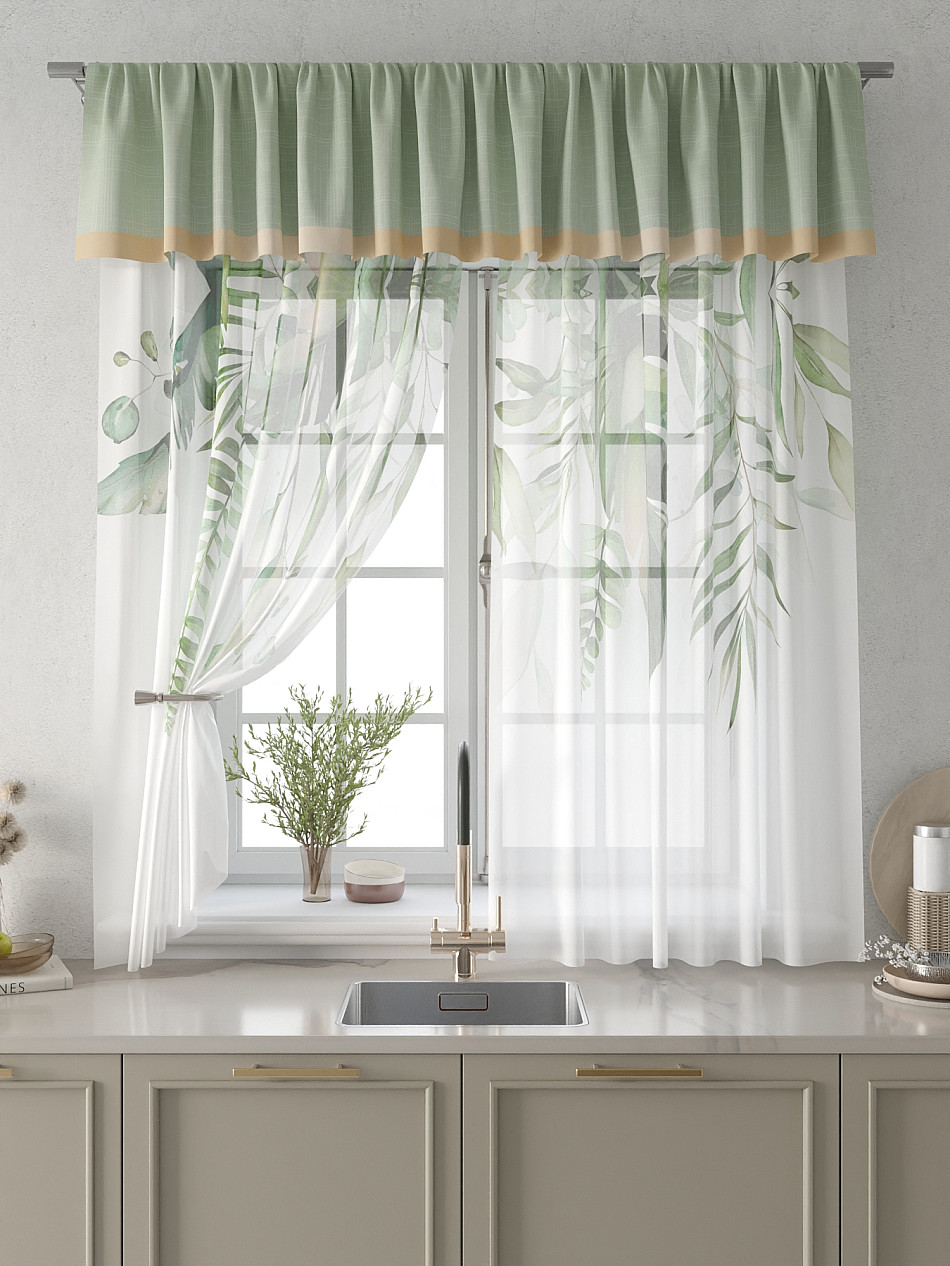 Вуаль 150х180 см. — 2 шт., Ламбрекен 300х40 см. — 1 шт. Комплект штор из вуали оформлены печатным рисунком. Печатный рисунок дает широкие возможности обновить интерьер фактически не требуя ремонта за счет огромного выбора. Ткани с печатным рисунком безопасны и не содержат токсичных веществ. Не смотря на то, что материал легкий, он имеет высокую плотность, мало загрязнятся и не требует особого ухода даже после стирки, что важно для кухонных занавесок. Тюль не выцветает, не растягивается, превосходно драпируются, образуя струящиеся складки. Прекрасное решение для создания красоты и уюта с помощью уникальных дизайнов.