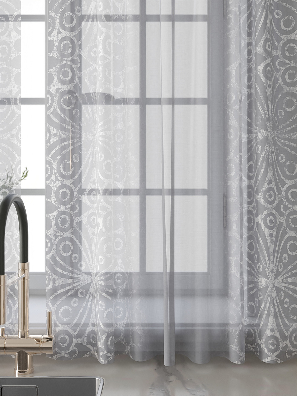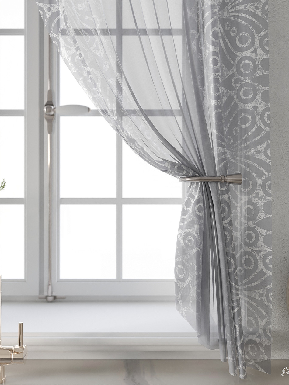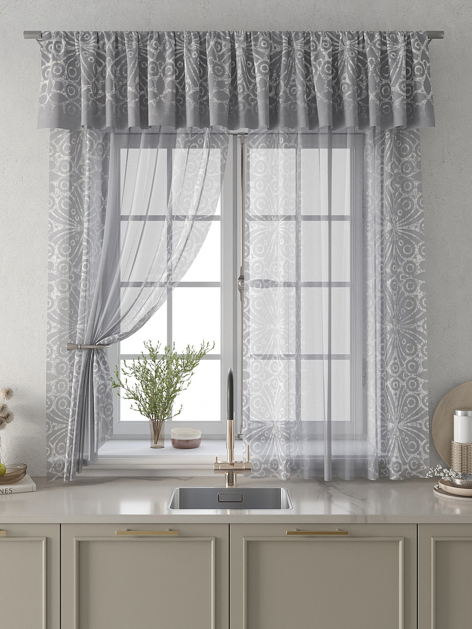 Вуаль 150х180 см. — 2 шт., Ламбрекен 300х40 см. — 1 шт. Комплект штор из вуали оформлены печатным рисунком. Печатный рисунок дает широкие возможности обновить интерьер фактически не требуя ремонта за счет огромного выбора. Ткани с печатным рисунком безопасны и не содержат токсичных веществ. Не смотря на то, что материал легкий, он имеет высокую плотность, мало загрязнятся и не требует особого ухода даже после стирки, что важно для кухонных занавесок. Тюль не выцветает, не растягивается, превосходно драпируются, образуя струящиеся складки. Прекрасное решение для создания красоты и уюта с помощью уникальных дизайнов.