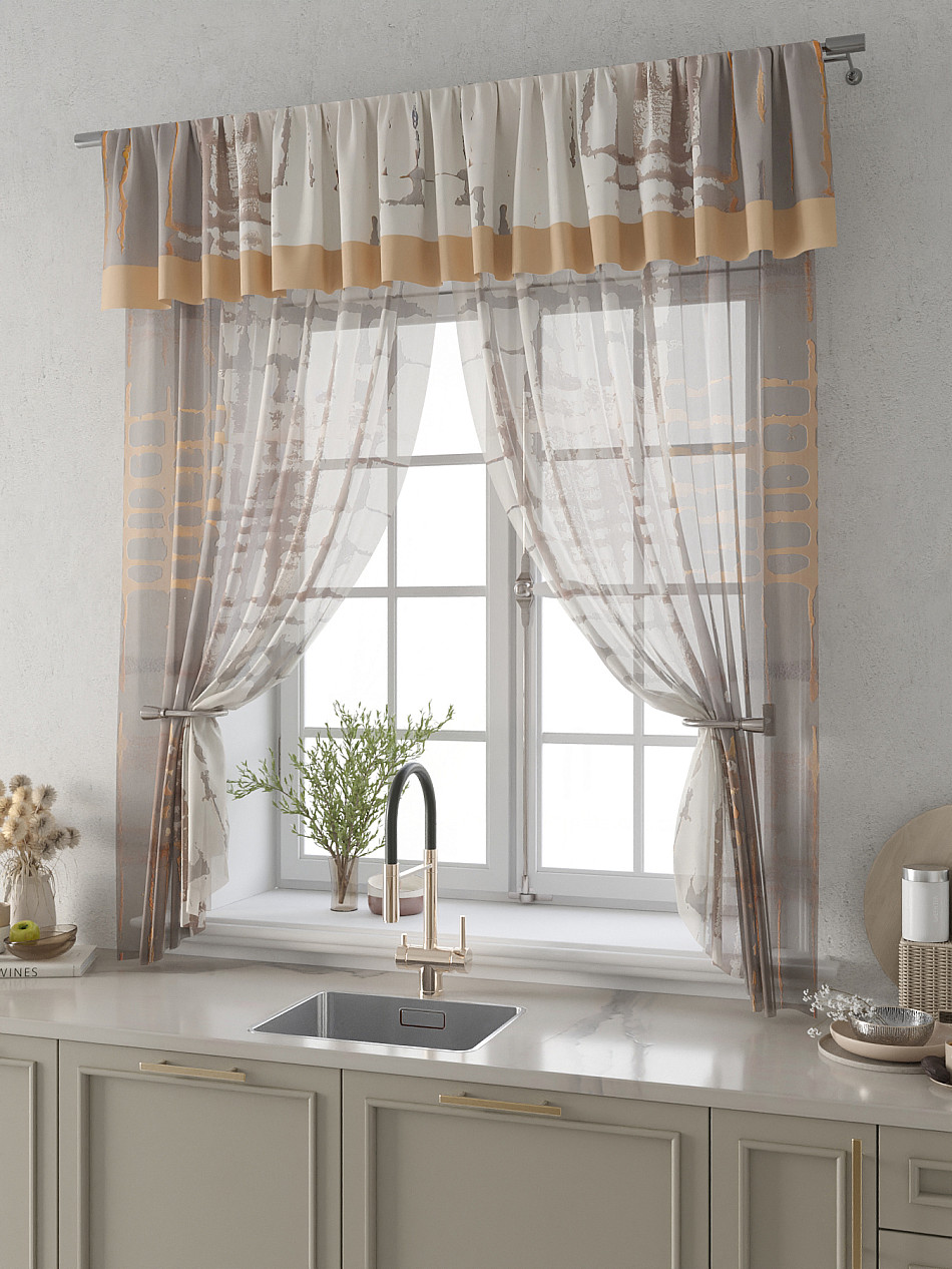Вуаль 150х180 см. — 2 шт., Ламбрекен 300х40 см. — 1 шт. Комплект штор из вуали оформлены печатным рисунком. Печатный рисунок дает широкие возможности обновить интерьер фактически не требуя ремонта за счет огромного выбора. Ткани с печатным рисунком безопасны и не содержат токсичных веществ. Не смотря на то, что материал легкий, он имеет высокую плотность, мало загрязнятся и не требует особого ухода даже после стирки, что важно для кухонных занавесок. Тюль не выцветает, не растягивается, превосходно драпируются, образуя струящиеся складки. Прекрасное решение для создания красоты и уюта с помощью уникальных дизайнов.