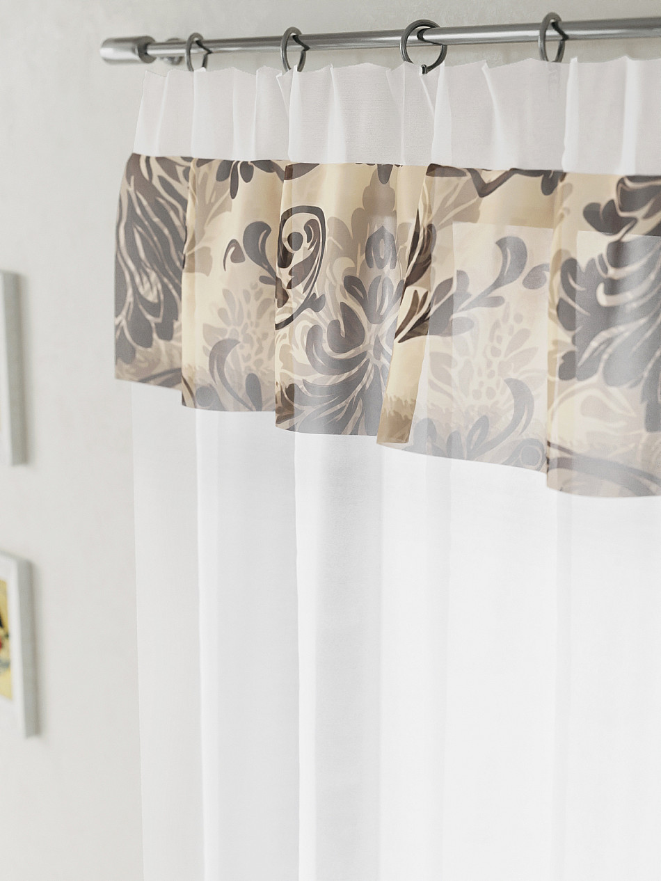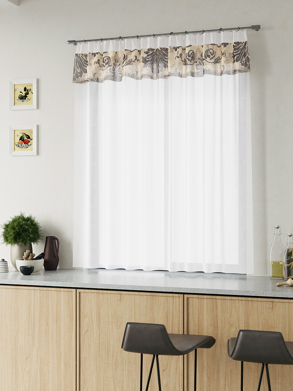 ВыбратьВуаль 150х160 см. — 1 шт. Белая вуаль оформлена печатным ламбрекеном. Печатный рисунок дает широкие возможности обновить интерьер фактически не требуя ремонта за счет огромного выбора. Ткани с печатным рисунком безопасны и не содержат токсичных веществ. Не смотря на то, что материал легкий, он имеет высокую плотность, мало загрязнятся и не требует особого ухода даже после стирки, что важно для кухонных занавесок. Тюль не выцветает, не растягивается, превосходно драпируются, образуя струящиеся складки. Прекрасное решение для создания красоты и уюта с помощью уникальных дизайнов.