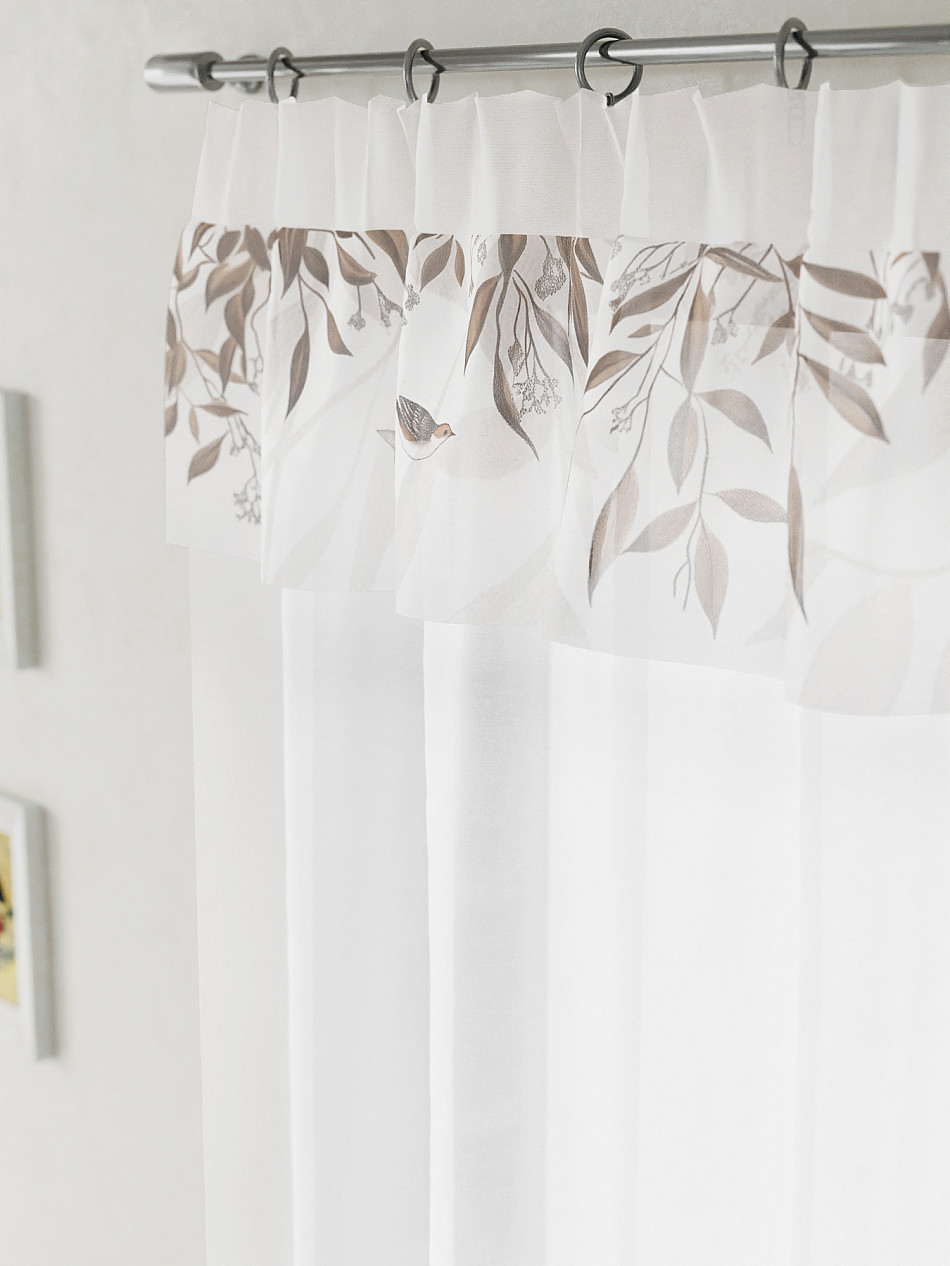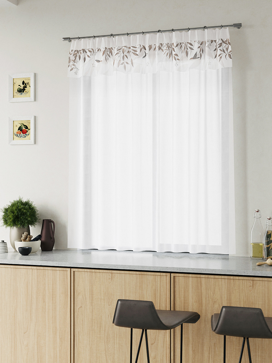ВыбратьВуаль 150х160 см. — 1 шт. Белая вуаль оформлена печатным ламбрекеном. Печатный рисунок дает широкие возможности обновить интерьер фактически не требуя ремонта за счет огромного выбора. Ткани с печатным рисунком безопасны и не содержат токсичных веществ. Не смотря на то, что материал легкий, он имеет высокую плотность, мало загрязнятся и не требует особого ухода даже после стирки, что важно для кухонных занавесок. Тюль не выцветает, не растягивается, превосходно драпируются, образуя струящиеся складки. Прекрасное решение для создания красоты и уюта с помощью уникальных дизайнов.