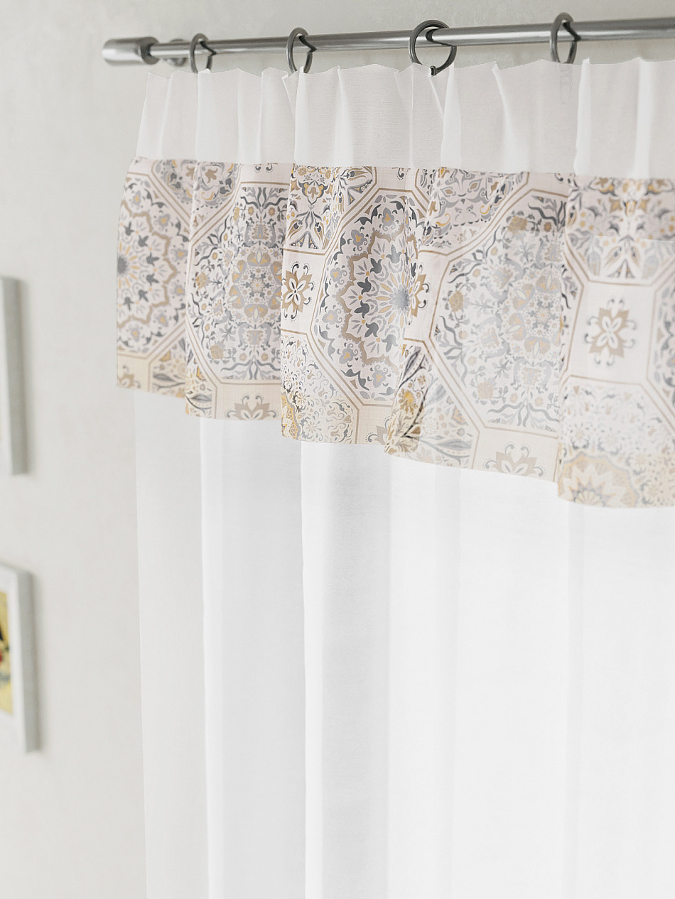 ВыбратьВуаль 150х160 см. — 1 шт. Белая вуаль оформлена печатным ламбрекеном. Печатный рисунок дает широкие возможности обновить интерьер фактически не требуя ремонта за счет огромного выбора. Ткани с печатным рисунком безопасны и не содержат токсичных веществ. Не смотря на то, что материал легкий, он имеет высокую плотность, мало загрязнятся и не требует особого ухода даже после стирки, что важно для кухонных занавесок. Тюль не выцветает, не растягивается, превосходно драпируются, образуя струящиеся складки. Прекрасное решение для создания красоты и уюта с помощью уникальных дизайнов.