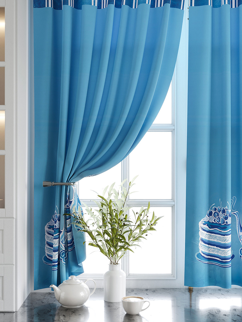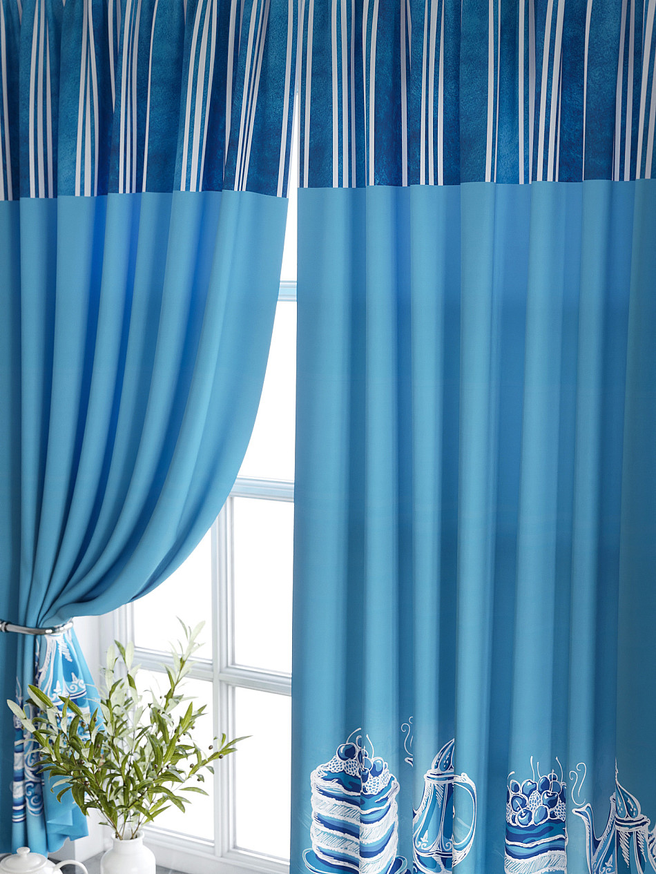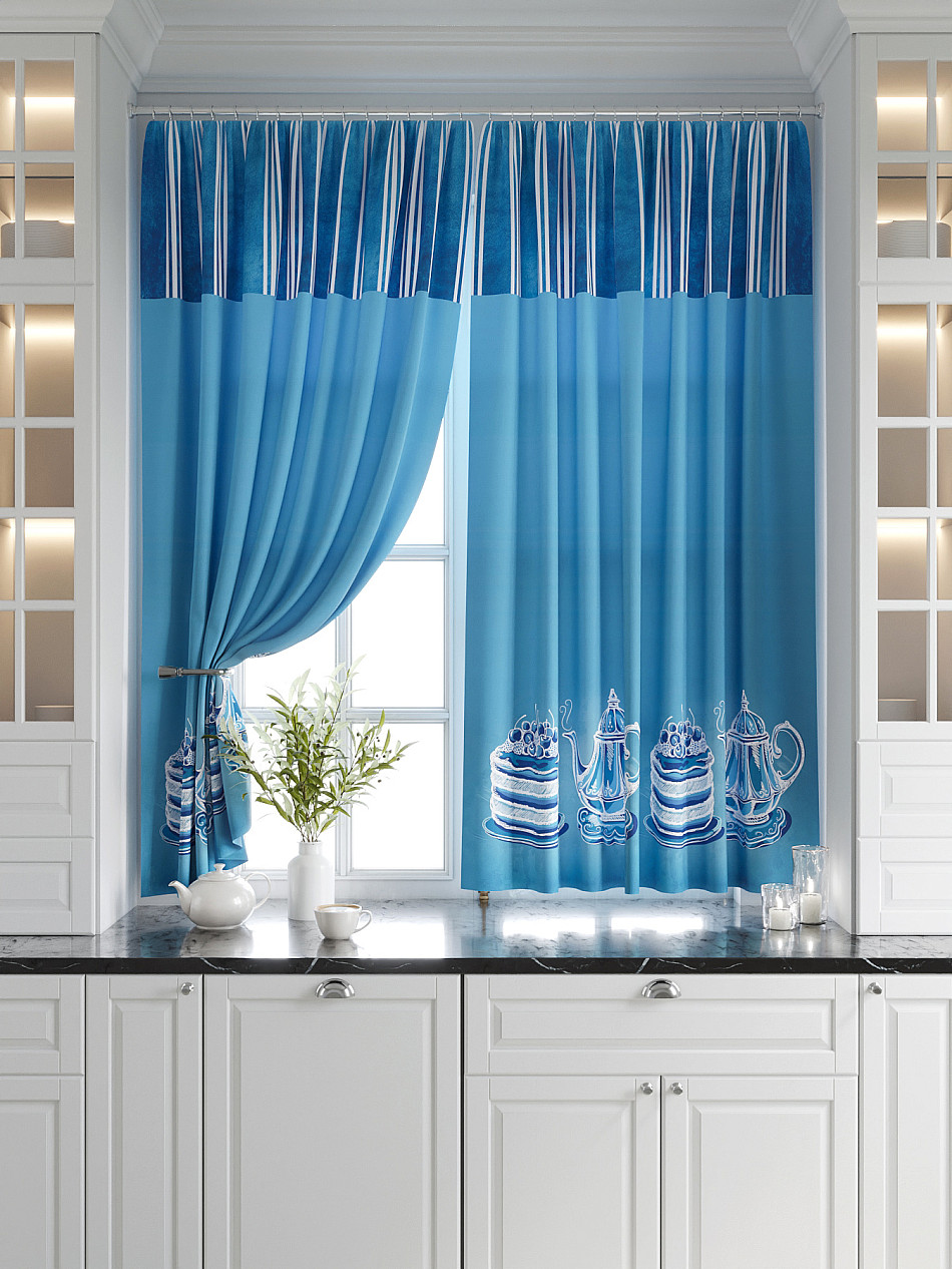 Комплект штор из легкой портьерной ткани (габардин) оформлен печатным рисунком. Печатный рисунок дает широкие возможности обновить интерьер фактически нет требуя ремонта за счет огромного выбора. Ткани с печатным рисунком безопасны и не содержат токсичных веществ. Не смотря на то что, материал легкий, он имеет высокую плотность, мало загрязнятся и не требует особого ухода даже после стирки, что важно для кухонных занавесок. Шторы не выцветают, не растягиваются, превосходно драпируются, образуя струящиеся складки. Прекрасное решение для создания красоты и уюта с помощью уникальных дизайнов.