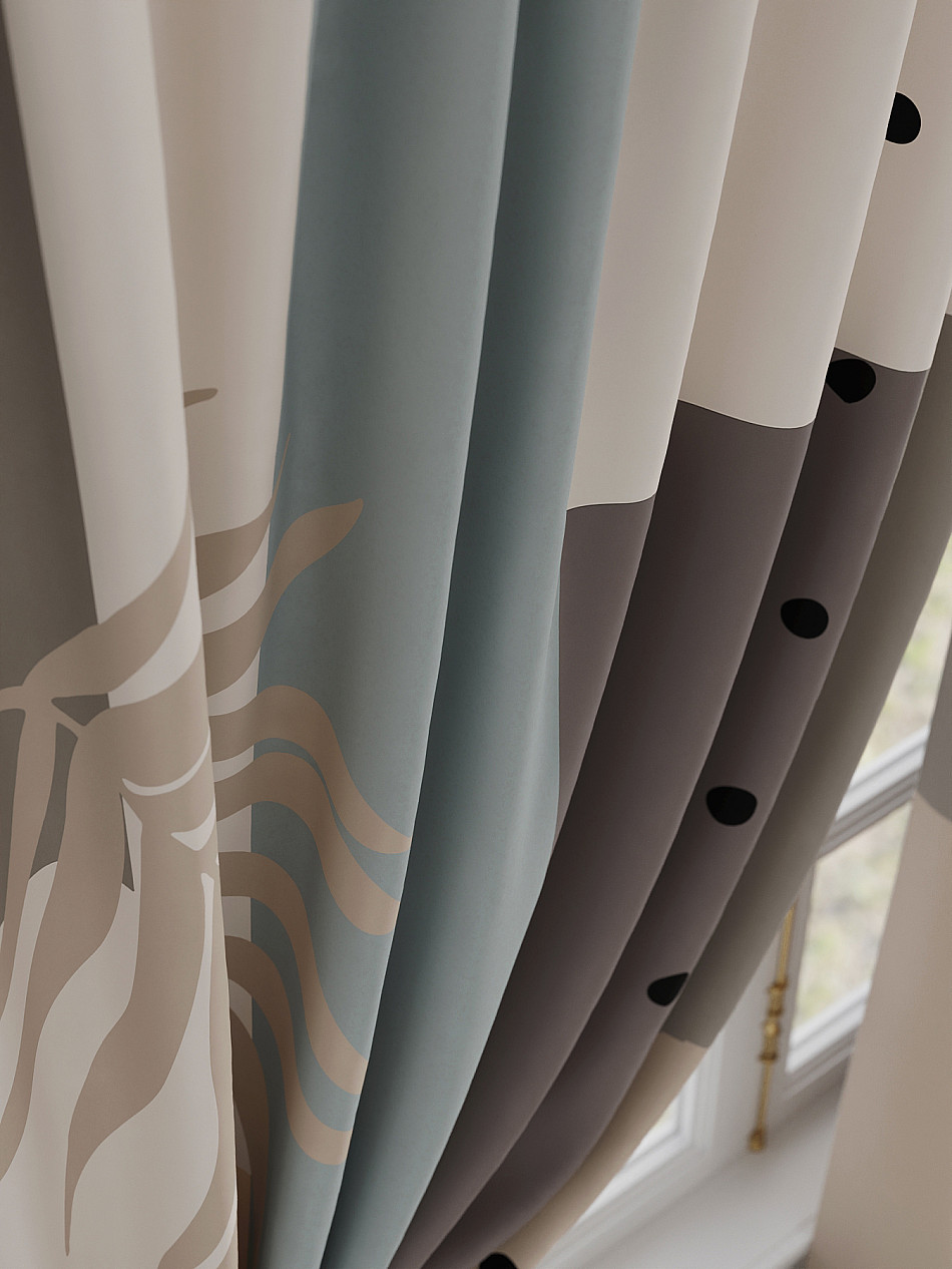 По верхнему краю портьер пришита шторная тесьма 6 см, с ее помощью затянув узелки от кордовых нитей с обеих сторон и стянув их до нужного размера можно сформировать округлые складки, далее вставить крючки в кармашки и повесить на карниз. Обязательно проверьте кордовые нити – они должны быть надежно завязаны, в противном случае во время стягивания они могут вылететь. Шторная тесьма имеет два ряда кармашков, с их помощью можно регулировать не только длину, но и ширину. Такое крепление подходит для всех типов карнизов.