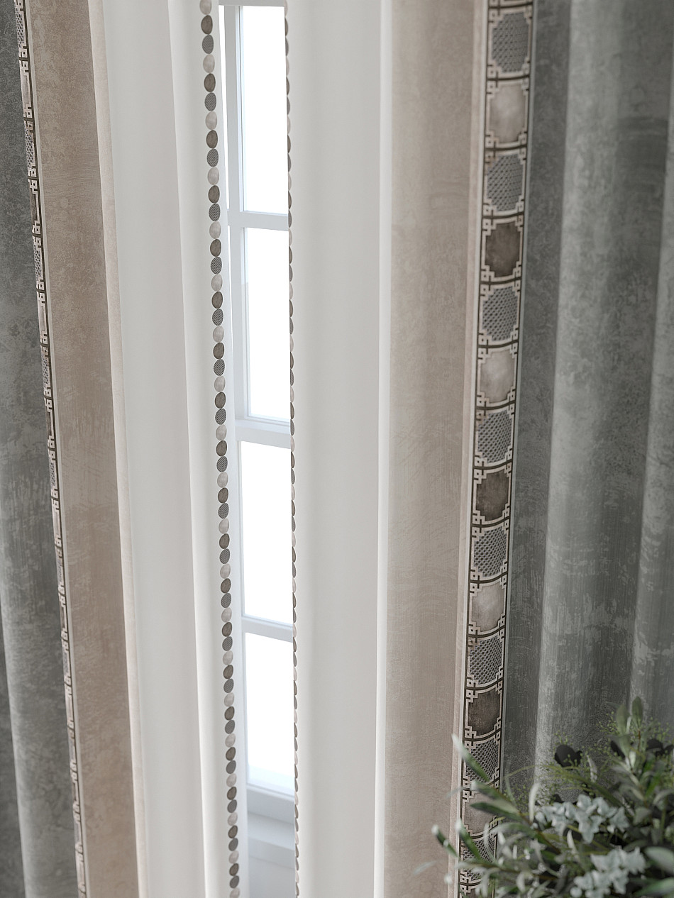 По верхнему краю портьер пришита шторная тесьма 6 см, с ее помощью затянув узелки от кордовых нитей с обеих сторон и стянув их до нужного размера можно сформировать округлые складки, далее вставить крючки в кармашки и повесить на карниз. Обязательно проверьте кордовые нити – они должны быть надежно завязаны, в противном случае во время стягивания они могут вылететь. Шторная тесьма имеет два ряда кармашков, с их помощью можно регулировать не только длину, но и ширину. Такое крепление подходит для всех типов карнизов.