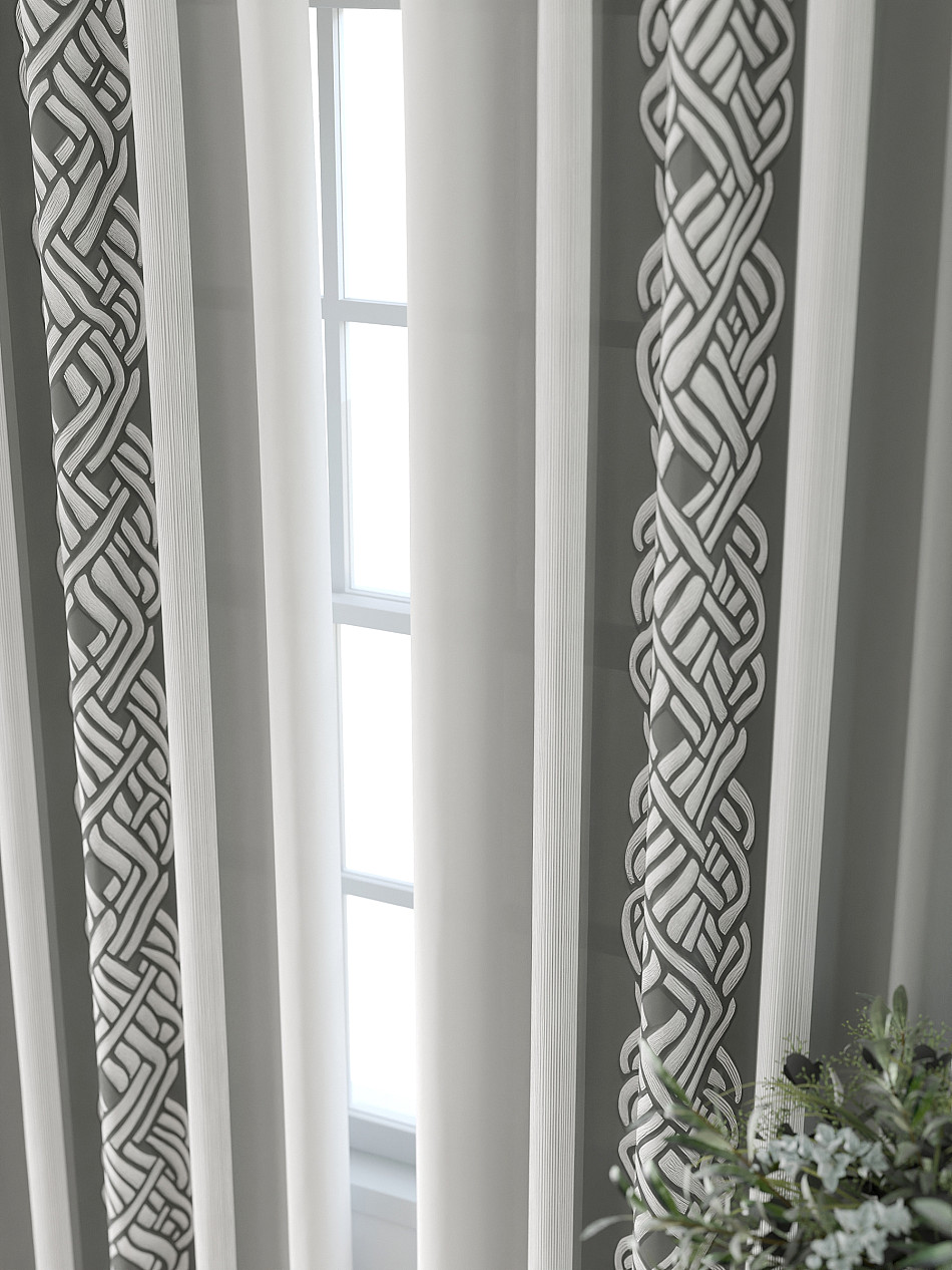 По верхнему краю портьер пришита шторная тесьма 6 см, с ее помощью затянув узелки от кордовых нитей с обеих сторон и стянув их до нужного размера можно сформировать округлые складки, далее вставить крючки в кармашки и повесить на карниз. Обязательно проверьте кордовые нити – они должны быть надежно завязаны, в противном случае во время стягивания они могут вылететь. Шторная тесьма имеет два ряда кармашков, с их помощью можно регулировать не только длину, но и ширину. Такое крепление подходит для всех типов карнизов.