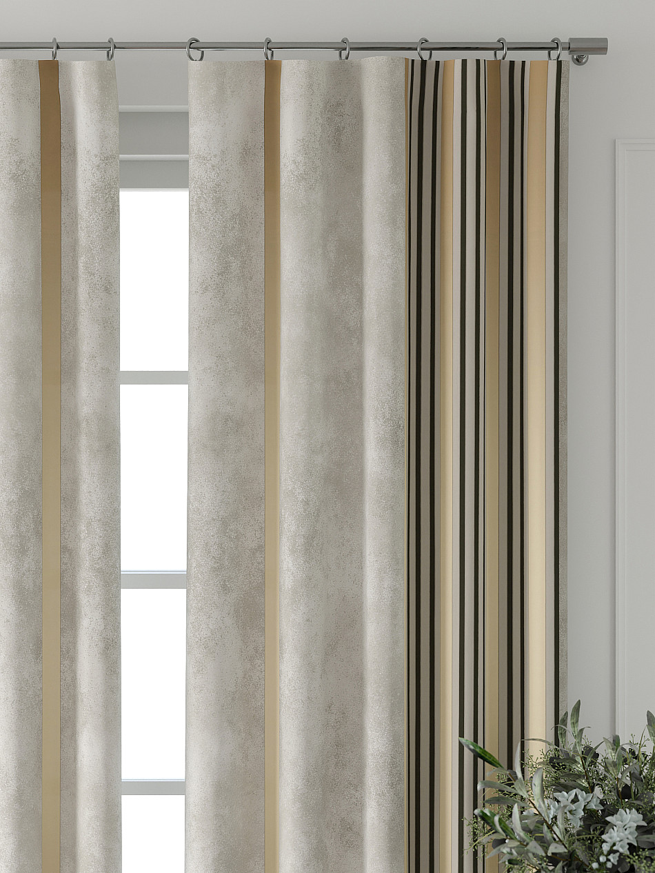 По верхнему краю портьер пришита шторная тесьма 6 см, с ее помощью затянув узелки от кордовых нитей с обеих сторон и стянув их до нужного размера можно сформировать округлые складки, далее вставить крючки в кармашки и повесить на карниз. Обязательно проверьте кордовые нити – они должны быть надежно завязаны, в противном случае во время стягивания они могут вылететь. Шторная тесьма имеет два ряда кармашков, с их помощью можно регулировать не только длину, но и ширину. Такое крепление подходит для всех типов карнизов.