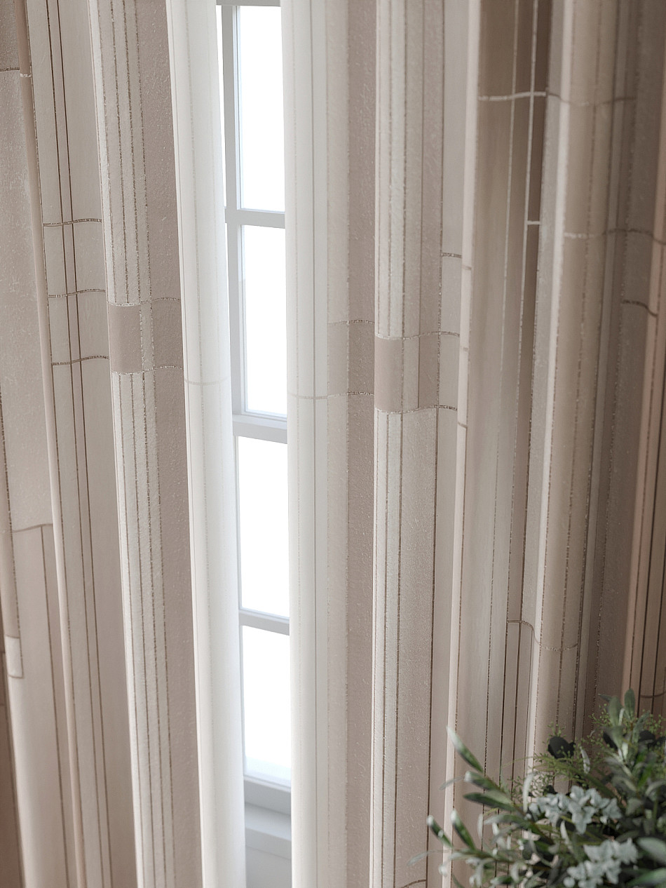 По верхнему краю портьер пришита шторная тесьма 6 см, с ее помощью затянув узелки от кордовых нитей с обеих сторон и стянув их до нужного размера можно сформировать округлые складки, далее вставить крючки в кармашки и повесить на карниз. Обязательно проверьте кордовые нити – они должны быть надежно завязаны, в противном случае во время стягивания они могут вылететь. Шторная тесьма имеет два ряда кармашков, с их помощью можно регулировать не только длину, но и ширину. Такое крепление подходит для всех типов карнизов.