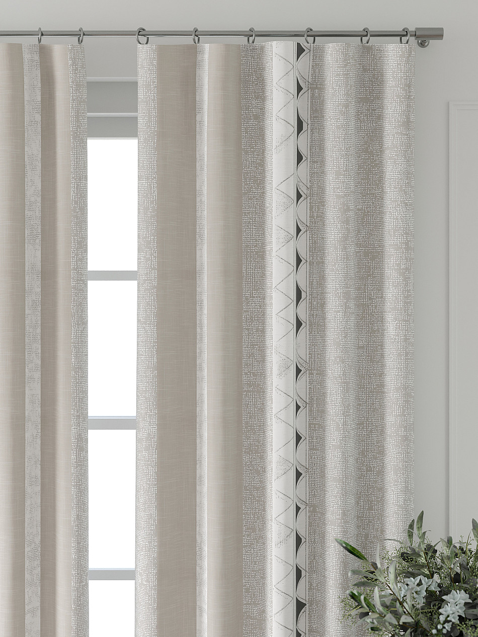 По верхнему краю портьеры пришита шторная тесьма 6 см, с ее помощью затянув узелки от кордовых нитей с обеих сторон и стянув их до нужного размера можно сформировать округлые складки, далее вставить крючки в кармашки и повесить на карниз. Обязательно проверьте кордовые нити – они должны быть надежно завязаны, в противном случае во время стягивания они могут вылететь. Шторная тесьма имеет два ряда кармашков, с их помощью можно регулировать не только длину, но и ширину. Такое крепление подходит для всех типов карнизов.