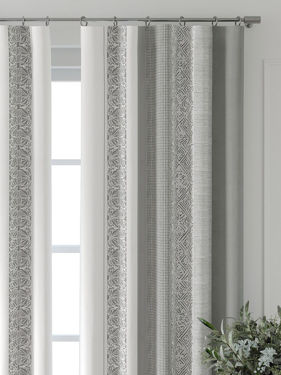 По верхнему краю портьеры пришита шторная тесьма 6 см, с ее помощью затянув узелки от кордовых нитей с обеих сторон и стянув их до нужного размера можно сформировать округлые складки, далее вставить крючки в кармашки и повесить на карниз. Обязательно проверьте кордовые нити – они должны быть надежно завязаны, в противном случае во время стягивания они могут вылететь. Шторная тесьма имеет два ряда кармашков, с их помощью можно регулировать не только длину, но и ширину. Такое крепление подходит для всех типов карнизов.
