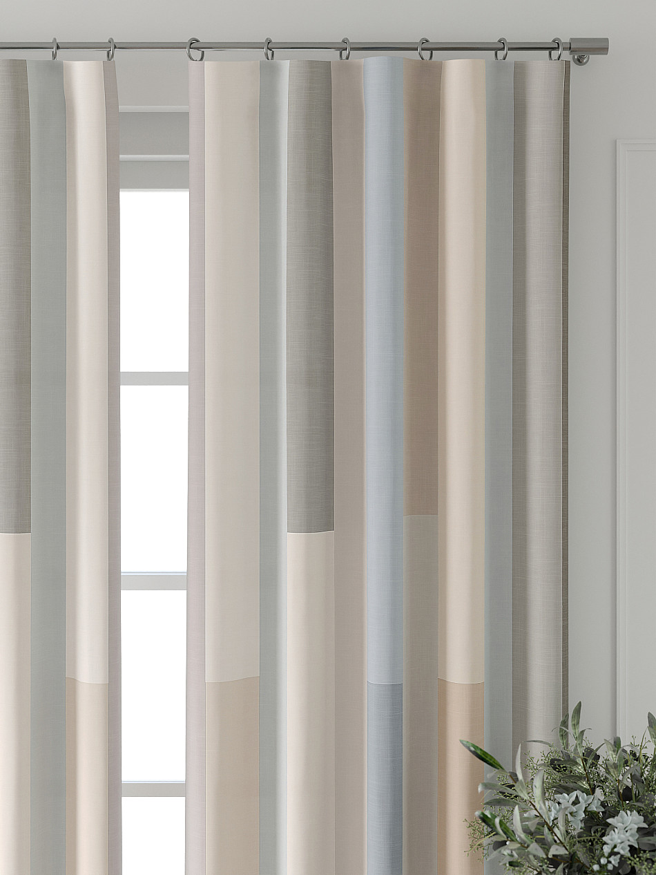 По верхнему краю портьер пришита шторная тесьма 6 см, с ее помощью затянув узелки от кордовых нитей с обеих сторон и стянув их до нужного размера можно сформировать округлые складки, далее вставить крючки в кармашки и повесить на карниз. Обязательно проверьте кордовые нити – они должны быть надежно завязаны, в противном случае во время стягивания они могут вылететь. Шторная тесьма имеет два ряда кармашков, с их помощью можно регулировать не только длину, но и ширину. Такое крепление подходит для всех типов карнизов.