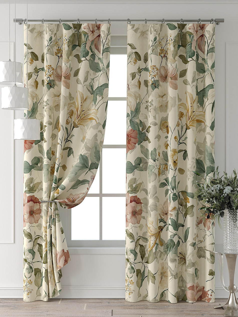 Портьера 2 шт. Подхват - доп.услуга. Комплект штор из легкой портьерной ткани (габардин) оформлен печатным рисунком. Печатный рисунок дает широкие возможности обновить интерьер фактически нет требуя ремонта за счет огромного выбора. Ткани с печатным рисунком безопасны и не содержат токсичных веществ. Не смотря на то что, материал легкий, он имеет высокую плотность, мало загрязнятся и не требует особого ухода даже после стирки, что важно для кухонных занавесок. Шторы не выцветают, не растягиваются, превосходно драпируются, образуя струящиеся складки. Прекрасное решение для создания красоты и уюта с помощью уникальных дизайнов.