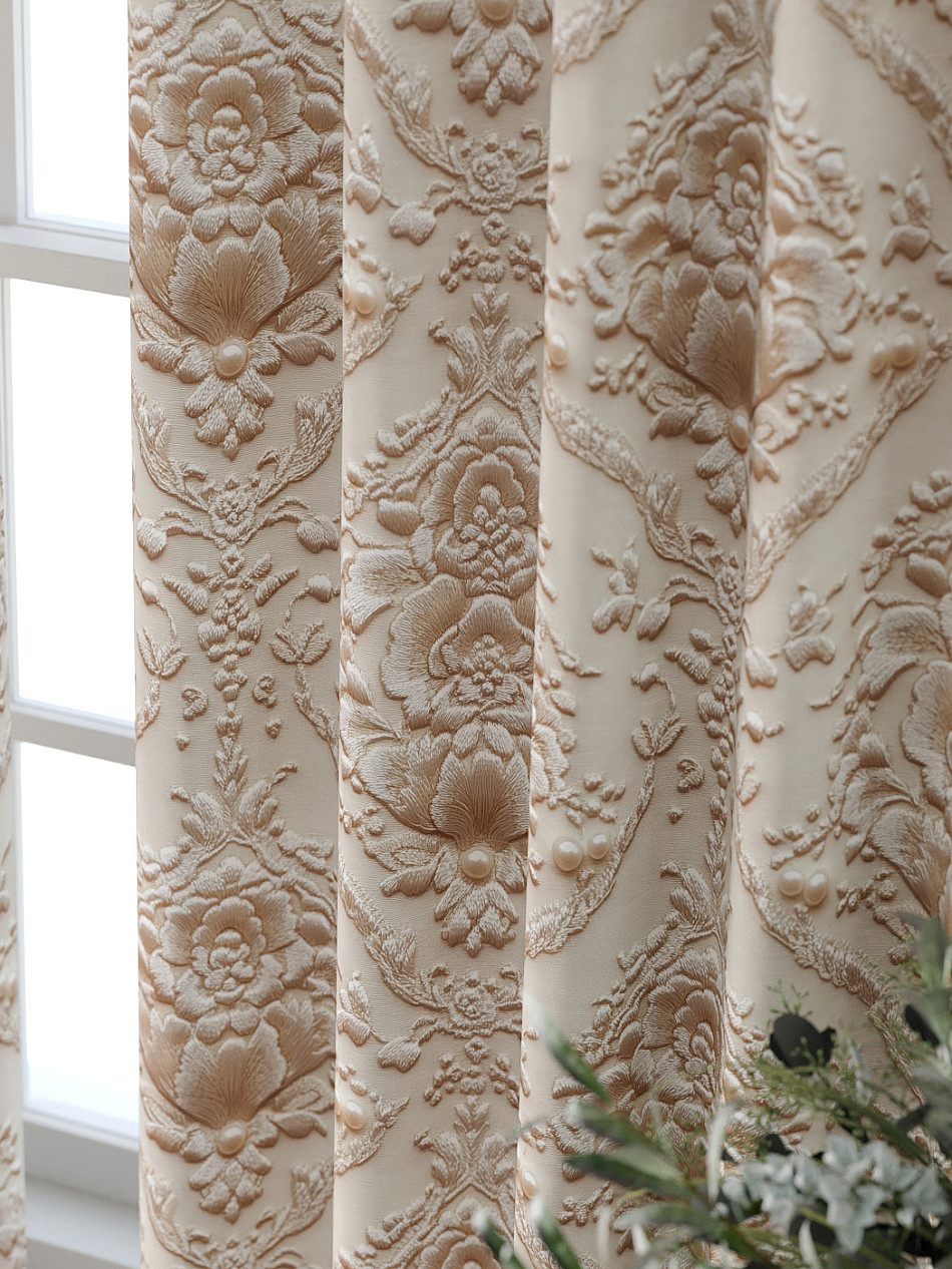 По верхнему краю портьер пришита шторная тесьма 6 см, с ее помощью затянув узелки от кордовых нитей с обеих сторон и стянув их до нужного размера можно сформировать округлые складки, далее вставить крючки в кармашки и повесить на карниз. Обязательно проверьте кордовые нити – они должны быть надежно завязаны, в противном случае во время стягивания они могут вылететь. Шторная тесьма имеет два ряда кармашков, с их помощью можно регулировать не только длину, но и ширину. Такое крепление подходит для всех типов карнизов.