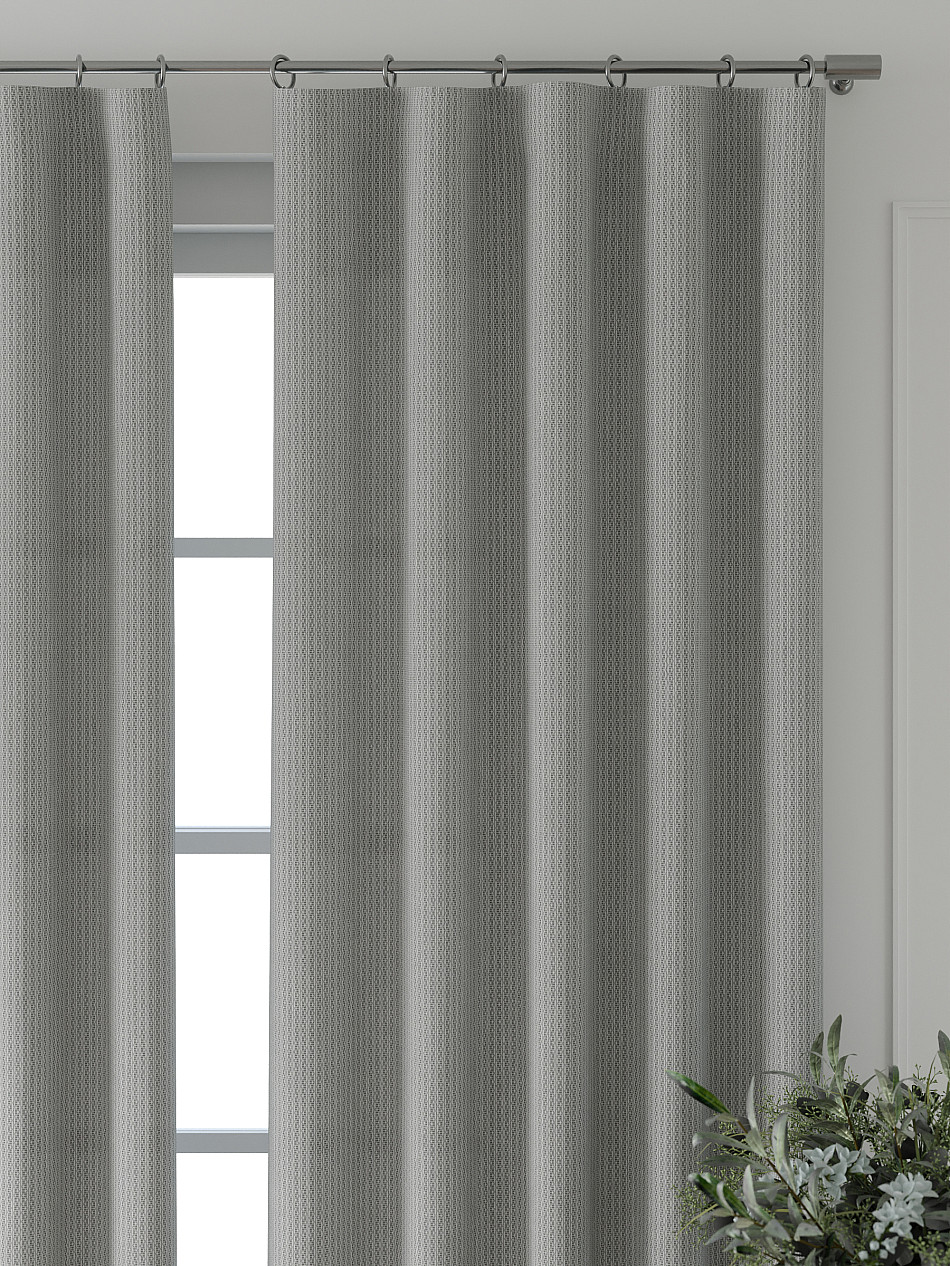 По верхнему краю портьер пришита шторная тесьма 6 см, с ее помощью затянув узелки от кордовых нитей с обеих сторон и стянув их до нужного размера можно сформировать округлые складки, далее вставить крючки в кармашки и повесить на карниз. Обязательно проверьте кордовые нити – они должны быть надежно завязаны, в противном случае во время стягивания они могут вылететь. Шторная тесьма имеет два ряда кармашков, с их помощью можно регулировать не только длину, но и ширину. Такое крепление подходит для всех типов карнизов.