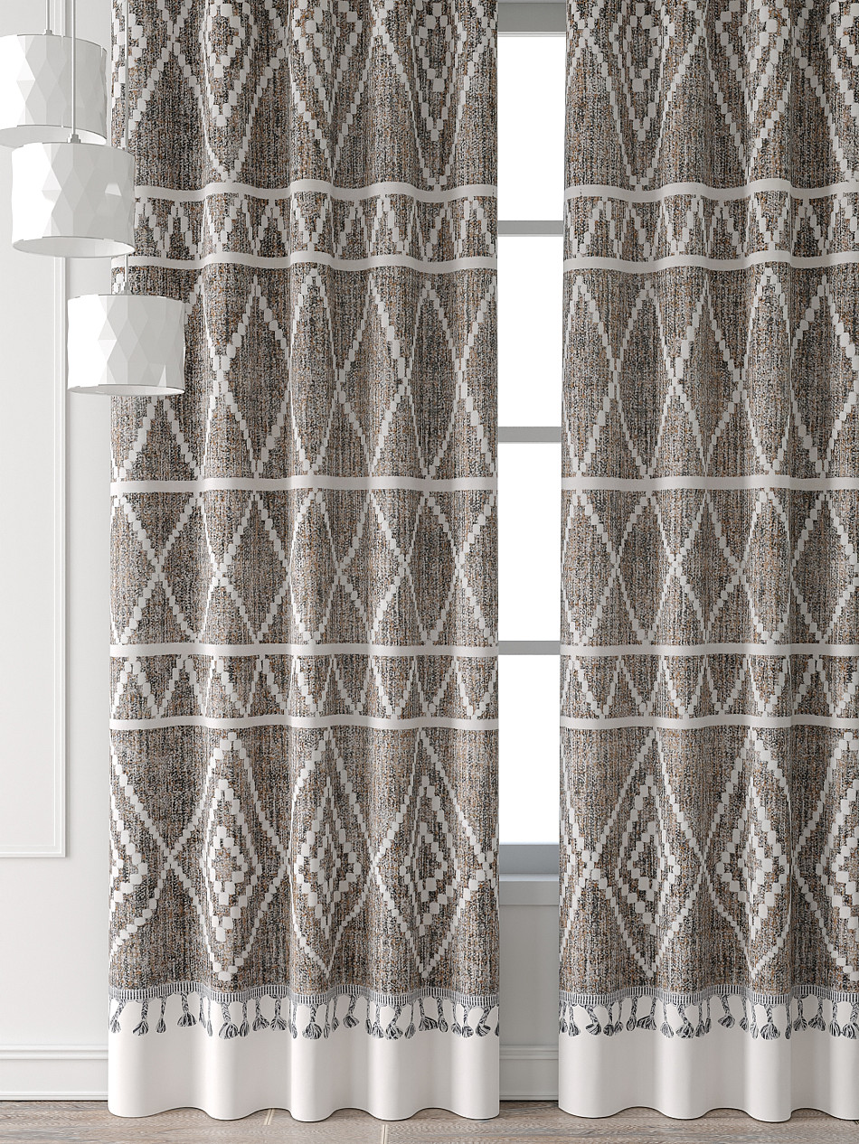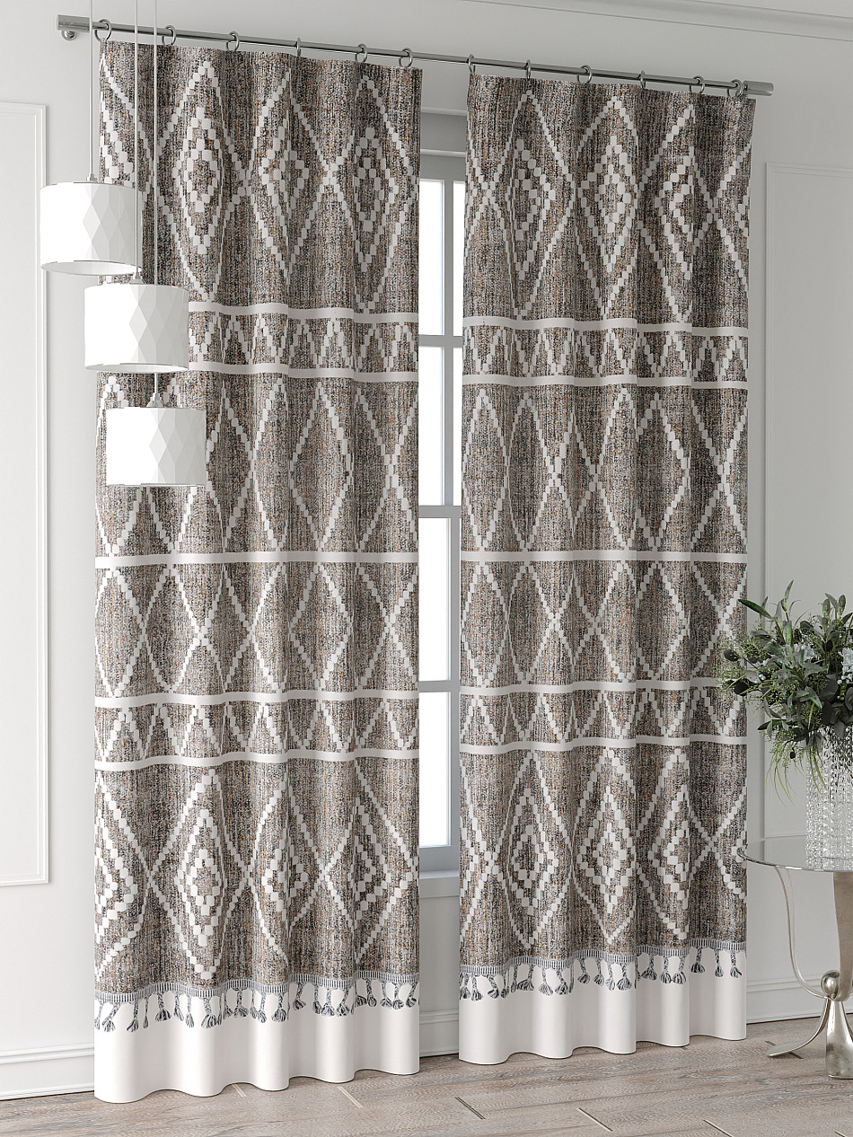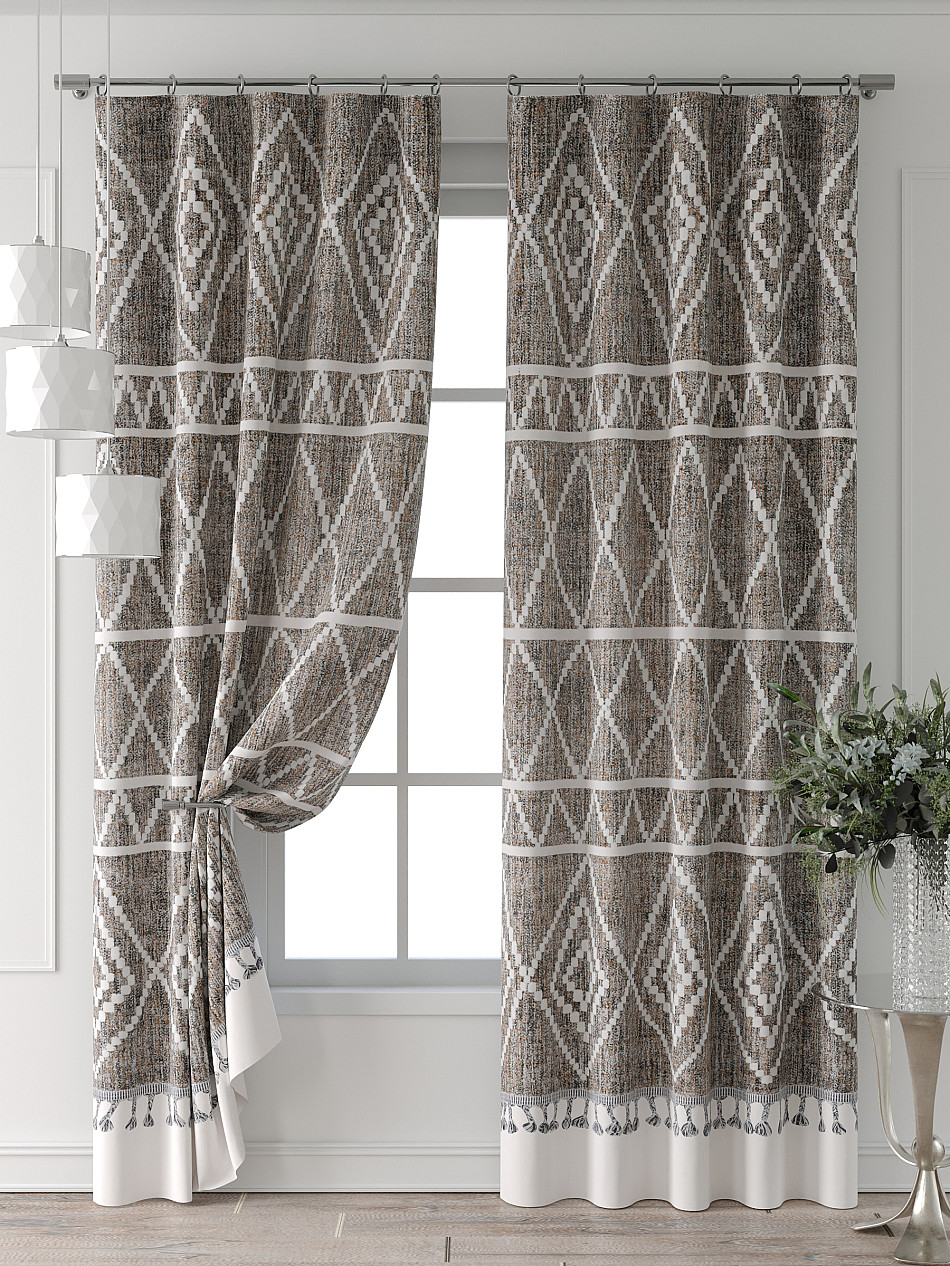 По верхнему краю портьер пришита шторная тесьма 6 см, с ее помощью затянув узелки от кордовых нитей с обеих сторон и стянув их до нужного размера можно сформировать округлые складки, далее вставить крючки в кармашки и повесить на карниз. Обязательно проверьте кордовые нити – они должны быть надежно завязаны, в противном случае во время стягивания они могут вылететь. Шторная тесьма имеет два ряда кармашков, с их помощью можно регулировать не только длину, но и ширину. Такое крепление подходит для всех типов карнизов.