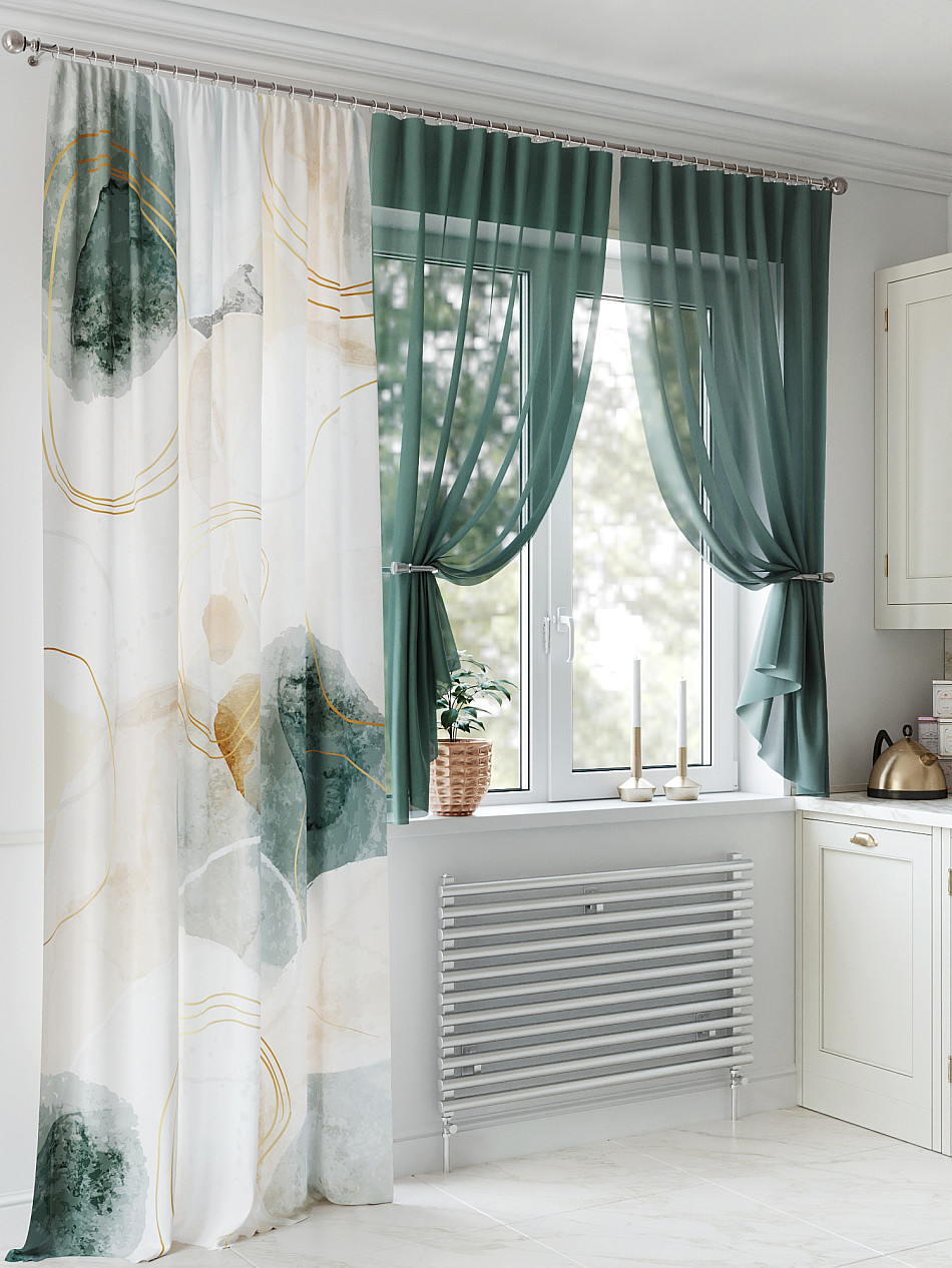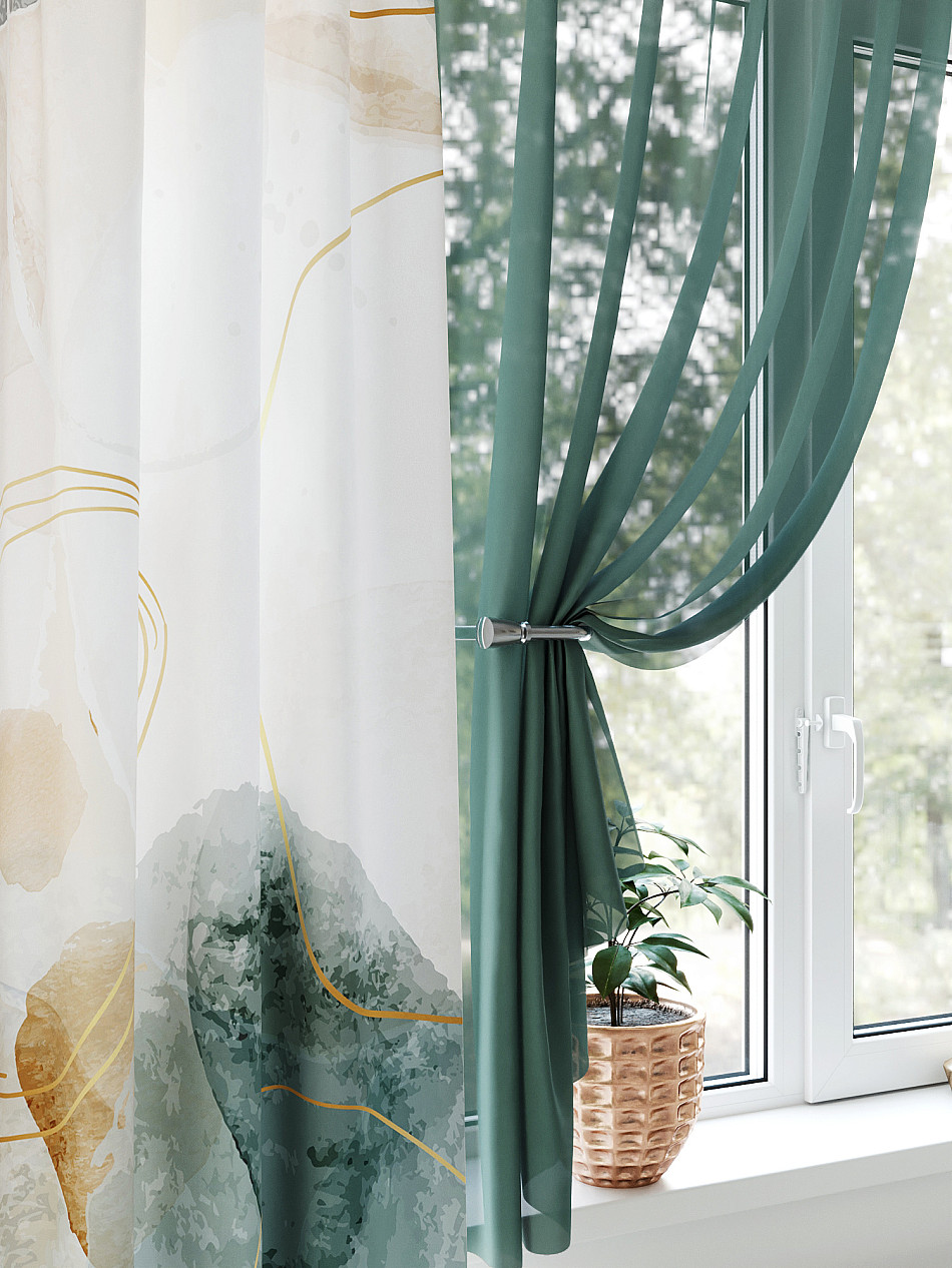 - Состав комплекта Портьера 150х270 см — 1 шт., вуаль 150х180 см — 2 шт.