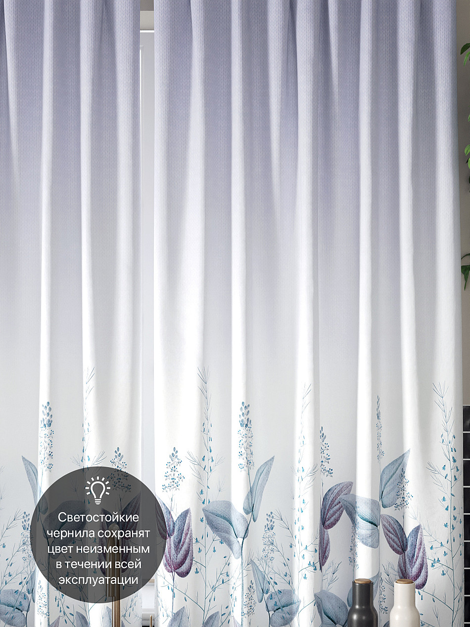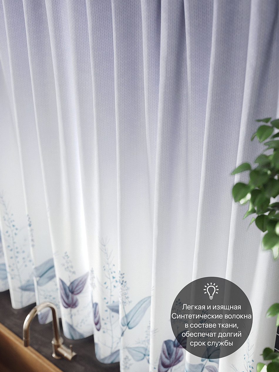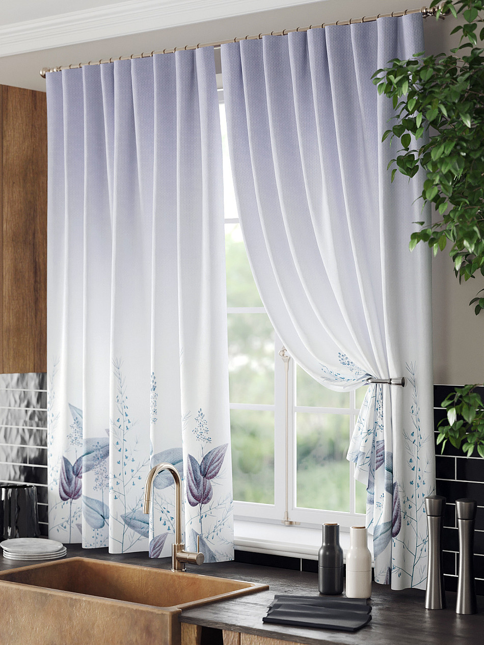 Комплект штор из легкой портьерной ткани (габардин) оформлен печатным рисунком. Печатный рисунок дает широкие возможности обновить интерьер фактически нет требуя ремонта за счет огромного выбора. Ткани с печатным рисунком безопасны и не содержат токсичных веществ. Не смотря на то что, материал легкий, он имеет высокую плотность, мало загрязнятся и не требует особого ухода даже после стирки, что важно для кухонных занавесок. Шторы не выцветают, не растягиваются, превосходно драпируются, образуя струящиеся складки. Прекрасное решение для создания красоты и уюта с помощью уникальных дизайнов.