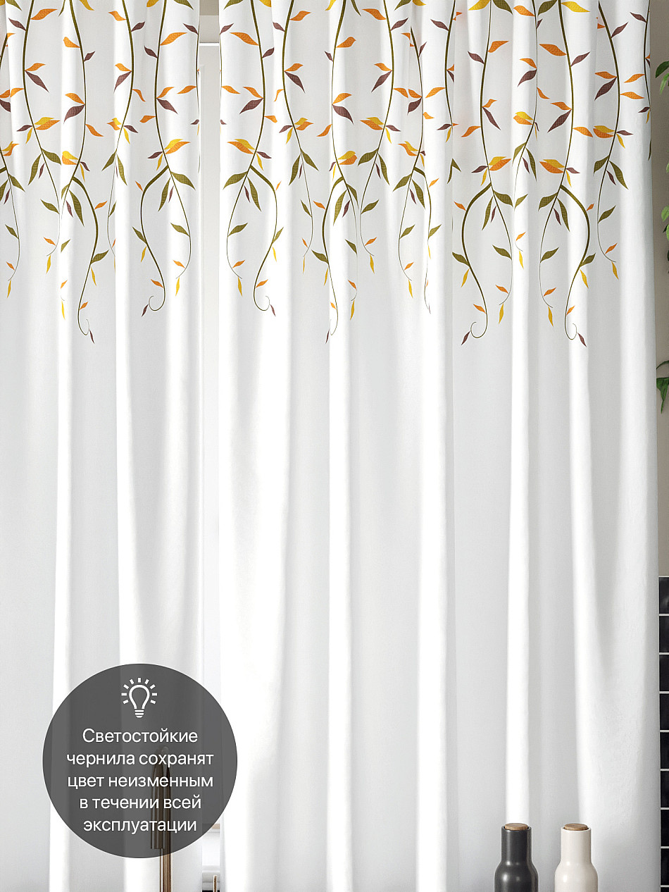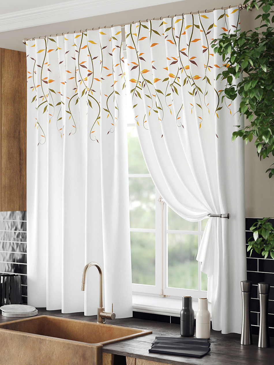 Комплект штор из легкой портьерной ткани (габардин) оформлен печатным рисунком. Печатный рисунок дает широкие возможности обновить интерьер фактически нет требуя ремонта за счет огромного выбора. Ткани с печатным рисунком безопасны и не содержат токсичных веществ. Не смотря на то что, материал легкий, он имеет высокую плотность, мало загрязнятся и не требует особого ухода даже после стирки, что важно для кухонных занавесок. Шторы не выцветают, не растягиваются, превосходно драпируются, образуя струящиеся складки. Прекрасное решение для создания красоты и уюта с помощью уникальных дизайнов.