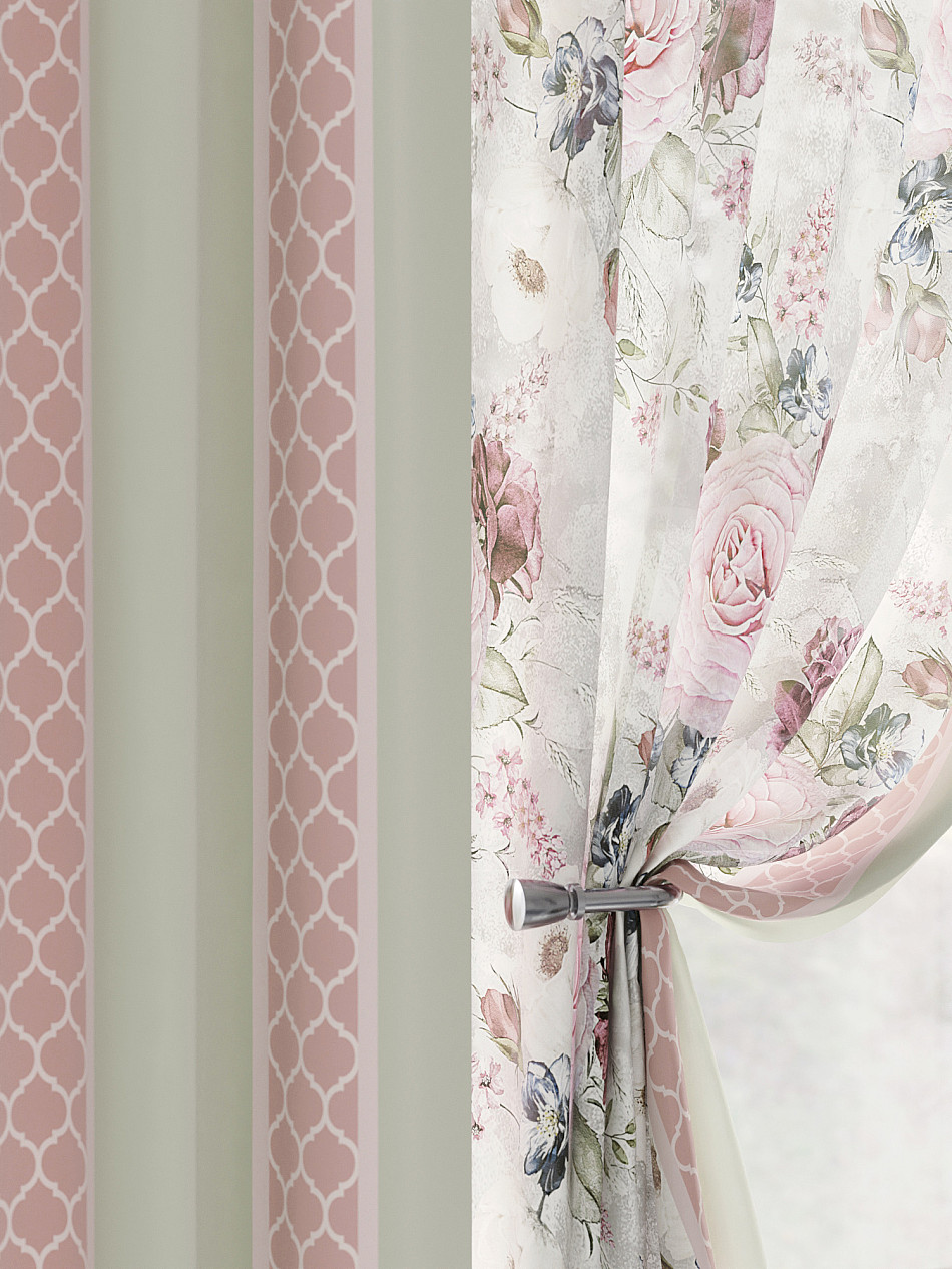 Тюль 2 шт.: Легкая основа (вуаль) оформлена флористическим рисунком. Ширина — 150 см., высота — 180 см., крепление — шторная лента (крючки).