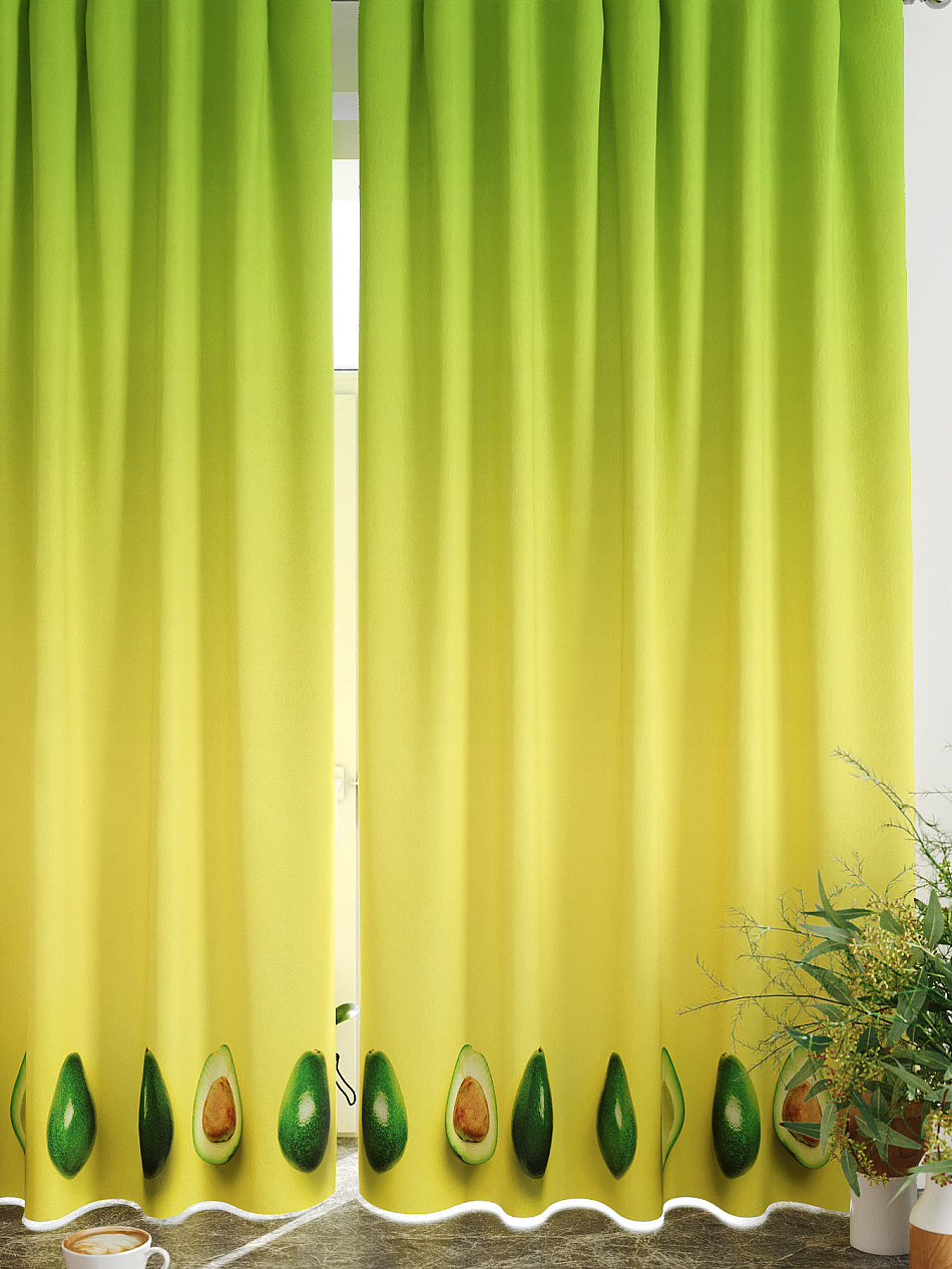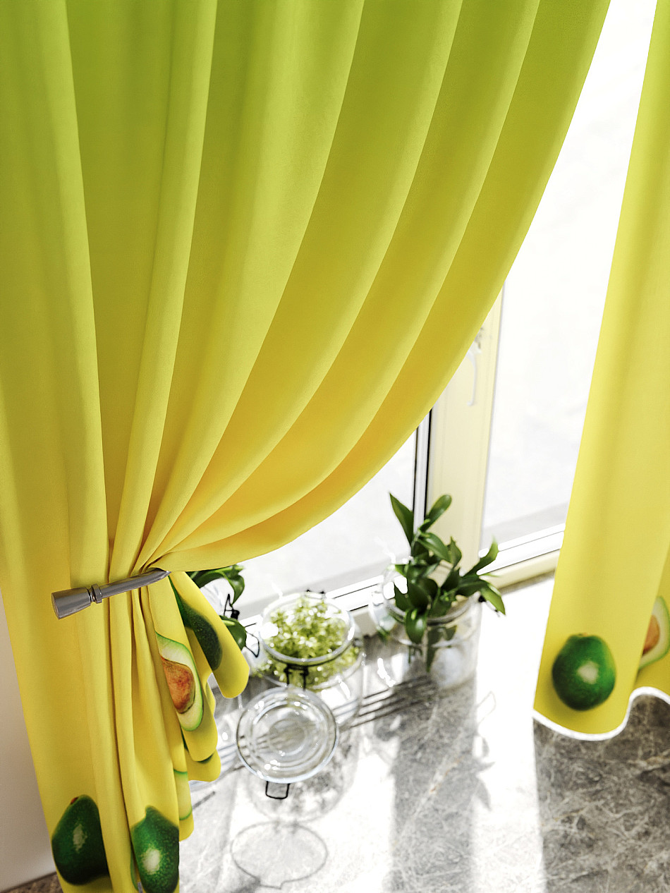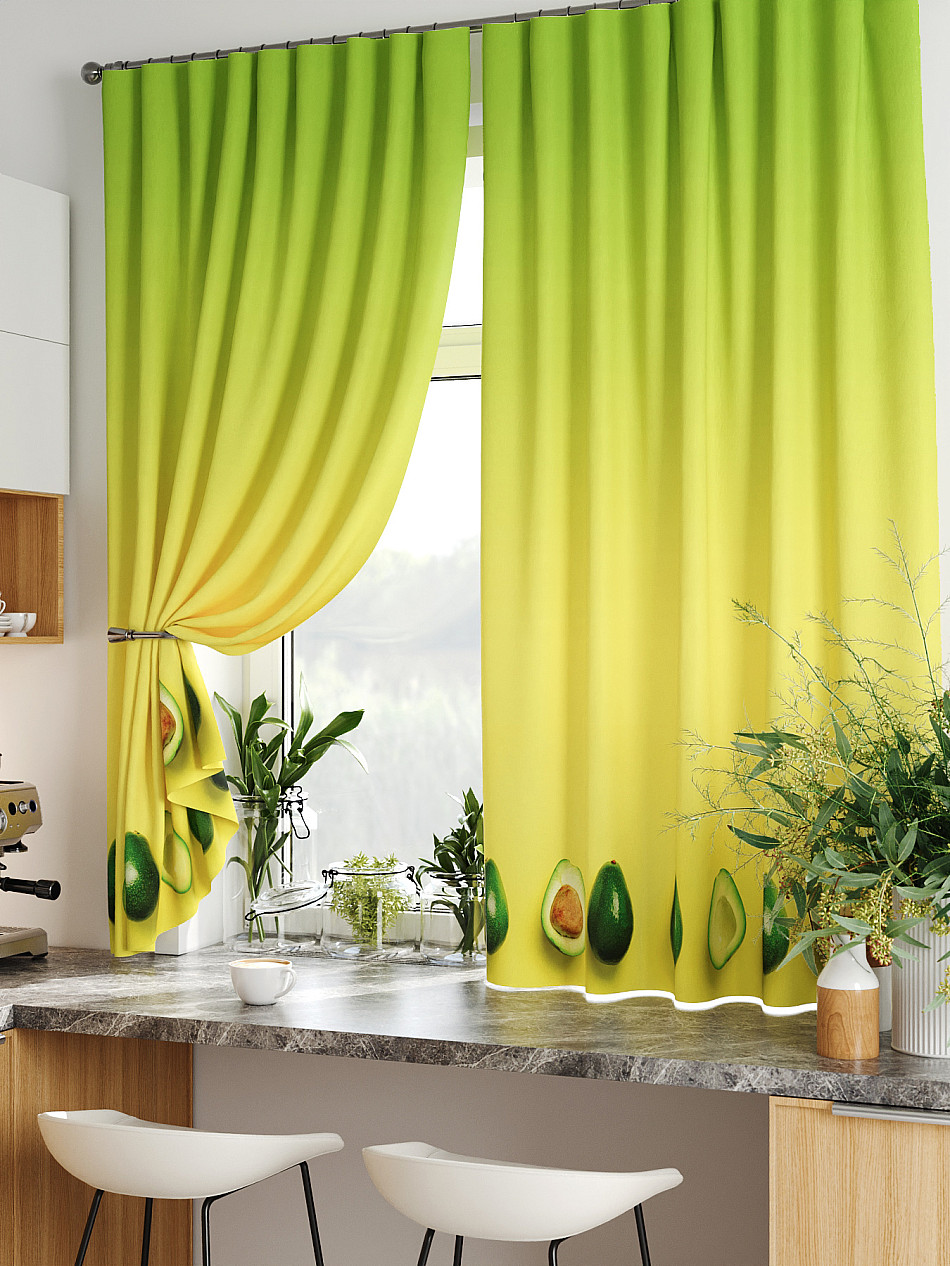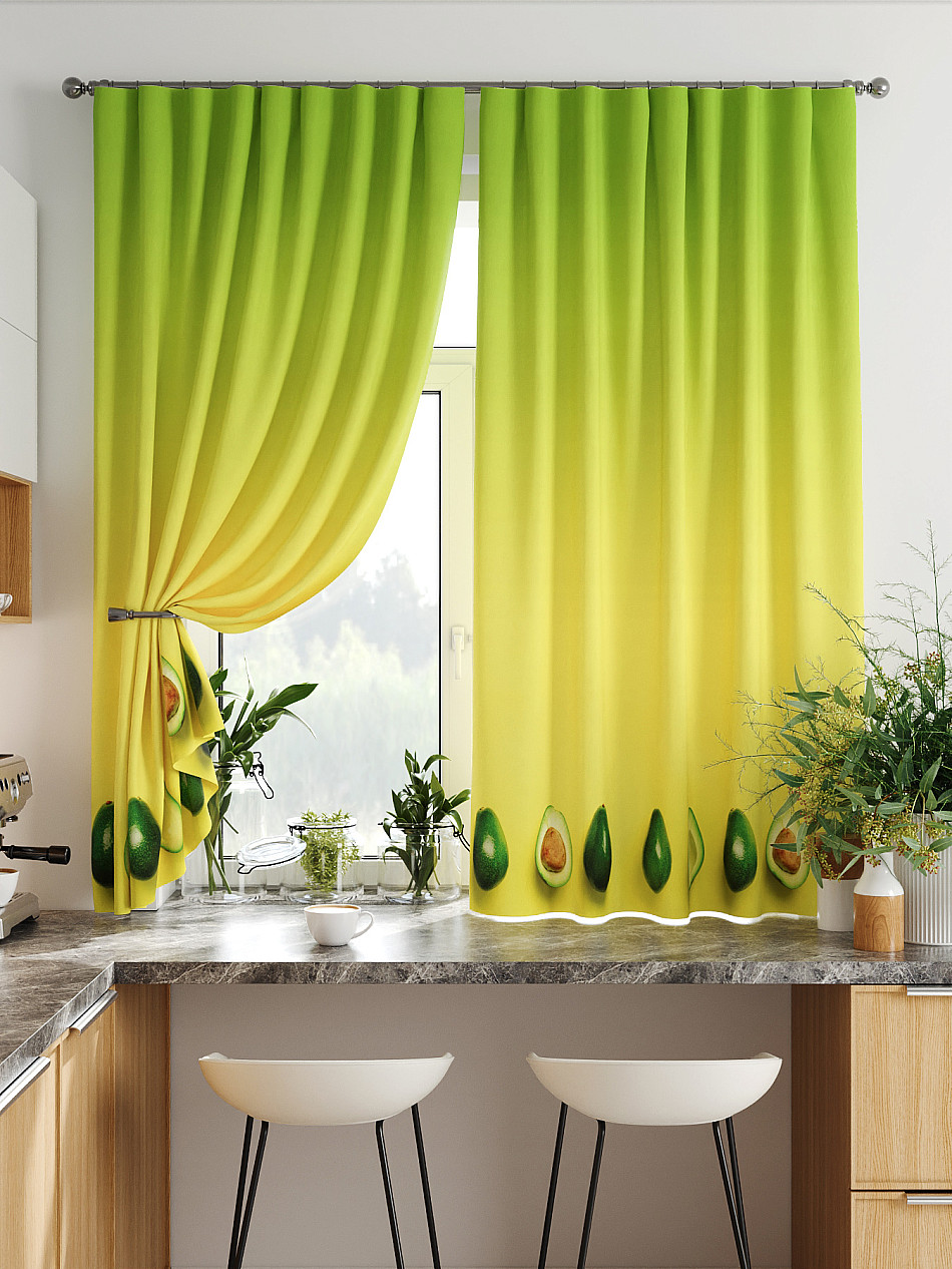 Комплект штор из легкой портьерной ткани (габардин) оформлен печатным рисунком. Печатный рисунок дает широкие возможности обновить интерьер фактически нет требуя ремонта за счет огромного выбора. Ткани с печатным рисунком безопасны и не содержат токсичных веществ. Не смотря на то что, материал легкий, он имеет высокую плотность, мало загрязнятся и не требует особого ухода даже после стирки, что важно для кухонных занавесок. Шторы не выцветают, не растягиваются, превосходно драпируются, образуя струящиеся складки. Прекрасное решение для создания красоты и уюта с помощью уникальных дизайнов.