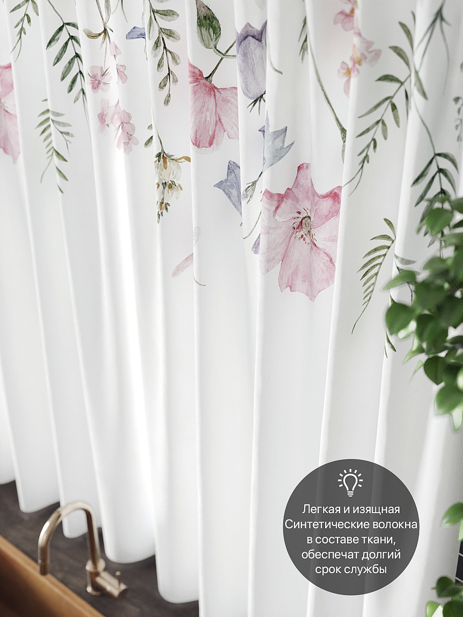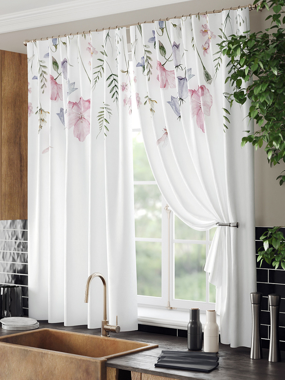 Комплект штор из легкой портьерной ткани (габардин) оформлен печатным рисунком. Печатный рисунок дает широкие возможности обновить интерьер фактически нет требуя ремонта за счет огромного выбора. Ткани с печатным рисунком безопасны и не содержат токсичных веществ. Не смотря на то что, материал легкий, он имеет высокую плотность, мало загрязнятся и не требует особого ухода даже после стирки, что важно для кухонных занавесок. Шторы не выцветают, не растягиваются, превосходно драпируются, образуя струящиеся складки. Прекрасное решение для создания красоты и уюта с помощью уникальных дизайнов.