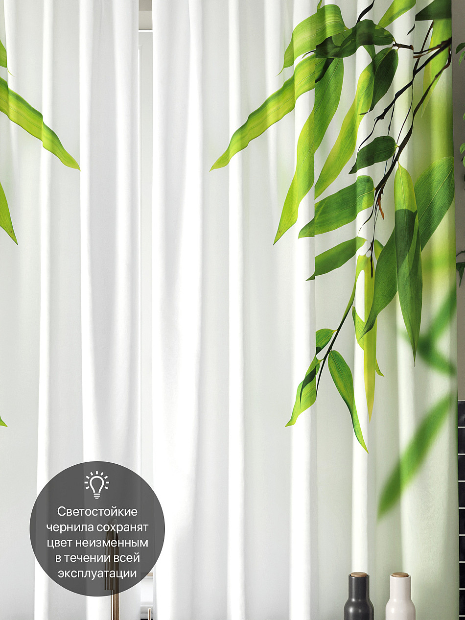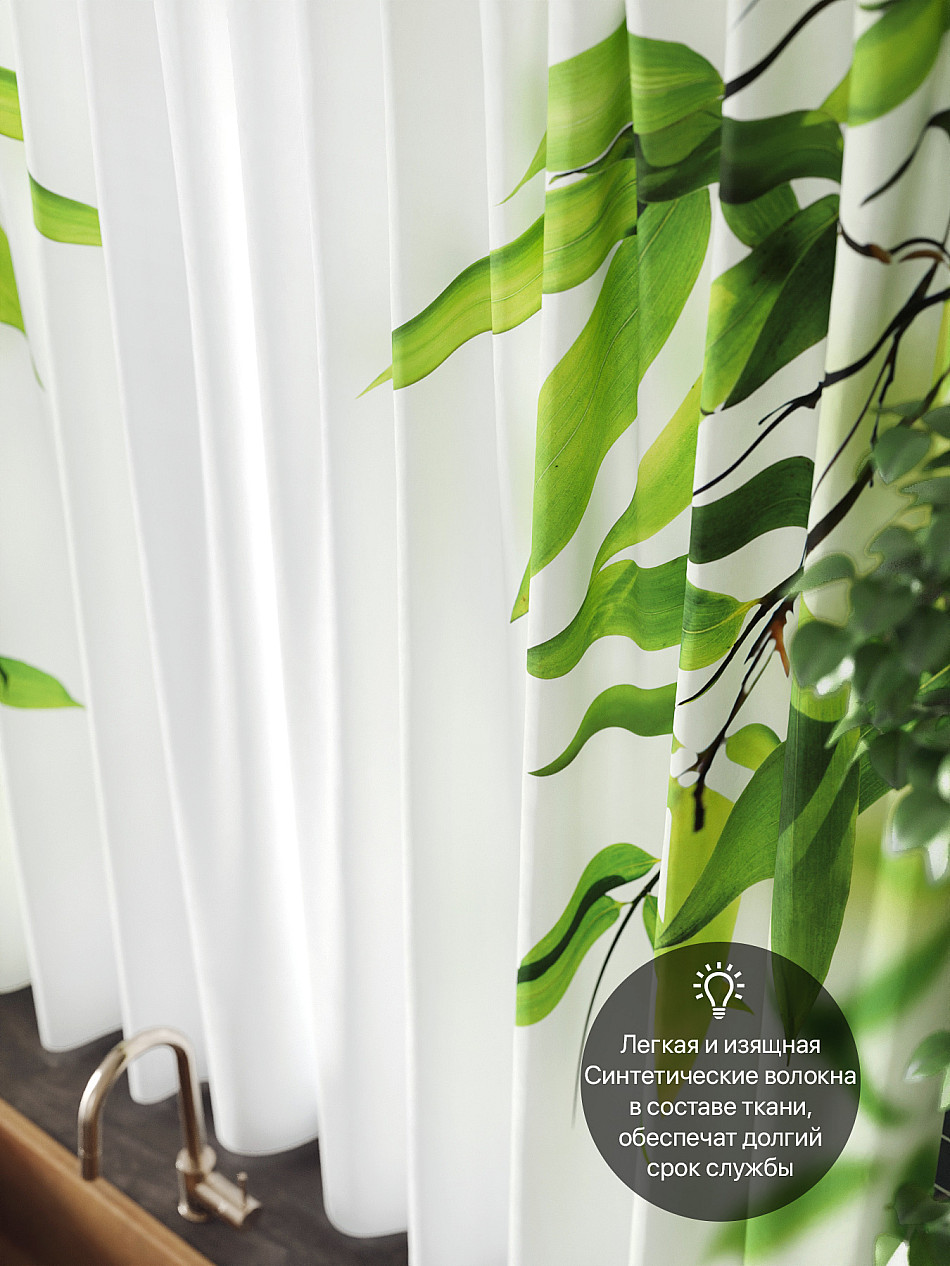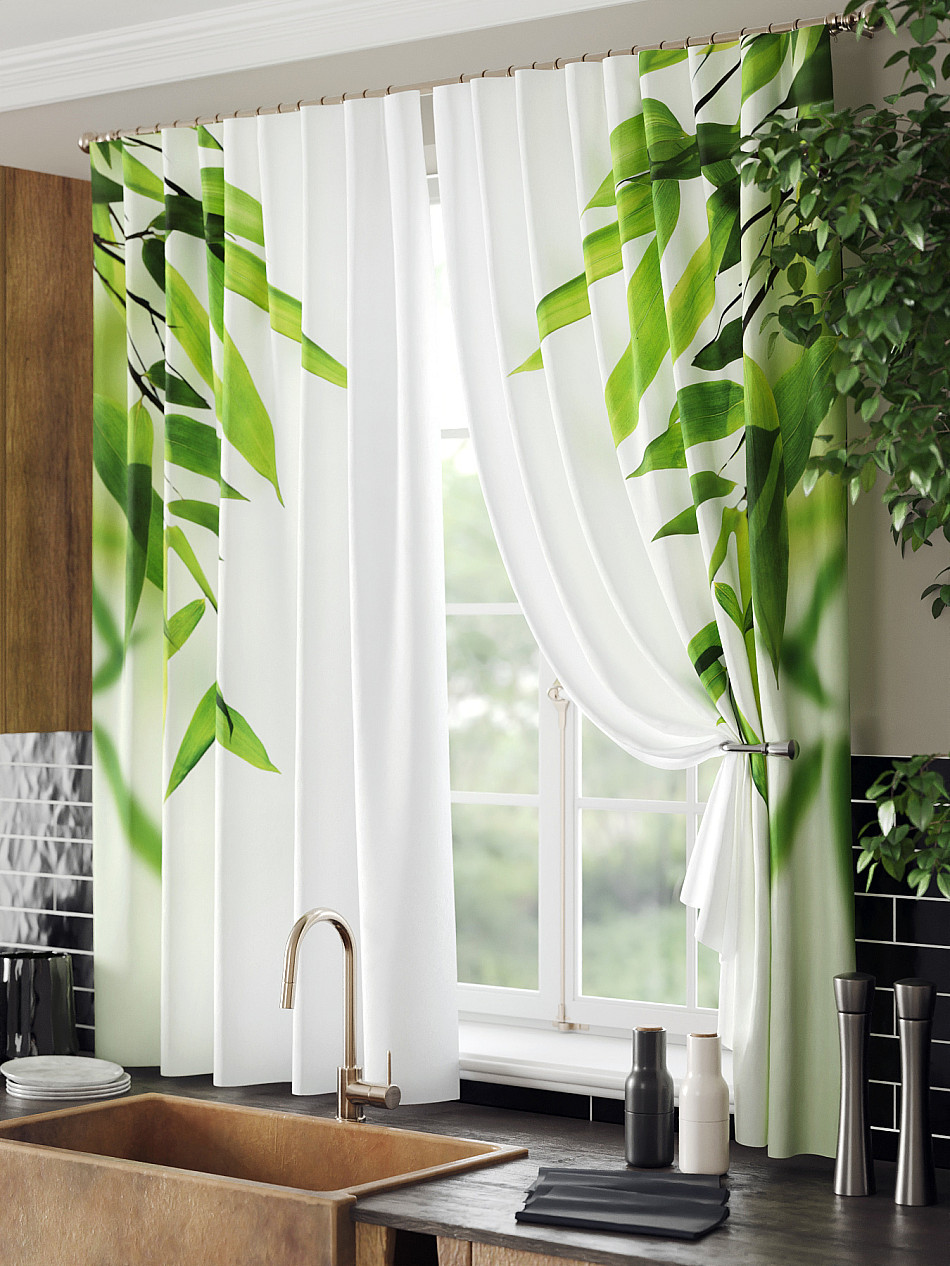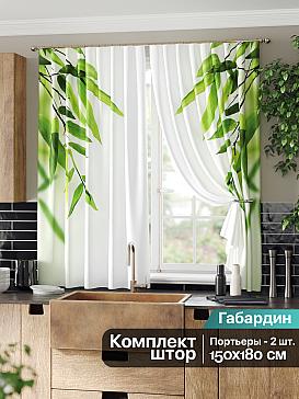 Комплект штор из легкой портьерной ткани (габардин) оформлен печатным рисунком. Печатный рисунок дает широкие возможности обновить интерьер фактически нет требуя ремонта за счет огромного выбора. Ткани с печатным рисунком безопасны и не содержат токсичных веществ. Не смотря на то что, материал легкий, он имеет высокую плотность, мало загрязнятся и не требует особого ухода даже после стирки, что важно для кухонных занавесок. Шторы не выцветают, не растягиваются, превосходно драпируются, образуя струящиеся складки. Прекрасное решение для создания красоты и уюта с помощью уникальных дизайнов.