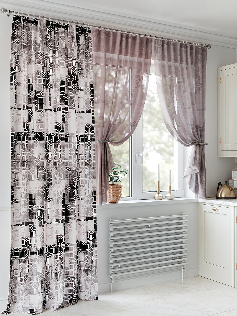 Портьера 150х250 см — 1 шт., вуаль 150х180 см — 2 шт. ( Уменьшить высоту ) Крепление: шторная лента (крючки), кулиска Подробнее