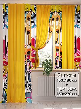 Портьеры 2 шт.: Легкая основа оформлена современным рисунком. Ширина — 150 см, высота — 180 см, крепление — шторная лента (крючки).