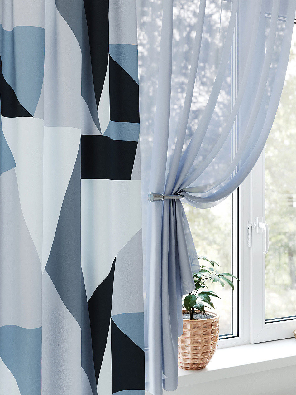 Тюль 2 шт.: Легкая основа (вуаль) оформлена геометрическим рисунком. Ширина — 150 см., высота — 180 см., крепление — шторная лента (крючки).