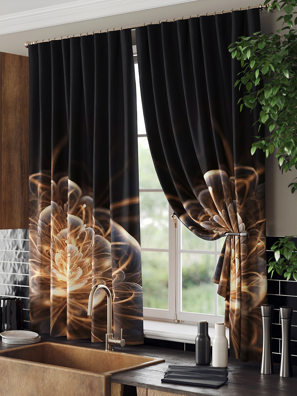 Комплект штор из легкой портьерной ткани (габардин) оформлен печатным рисунком. Печатный рисунок дает широкие возможности обновить интерьер фактически нет требуя ремонта за счет огромного выбора. Ткани с печатным рисунком безопасны и не содержат токсичных веществ. Не смотря на то что, материал легкий, он имеет высокую плотность, мало загрязнятся и не требует особого ухода даже после стирки, что важно для кухонных занавесок. Шторы не выцветают, не растягиваются, превосходно драпируются, образуя струящиеся складки. Прекрасное решение для создания красоты и уюта с помощью уникальных дизайнов.