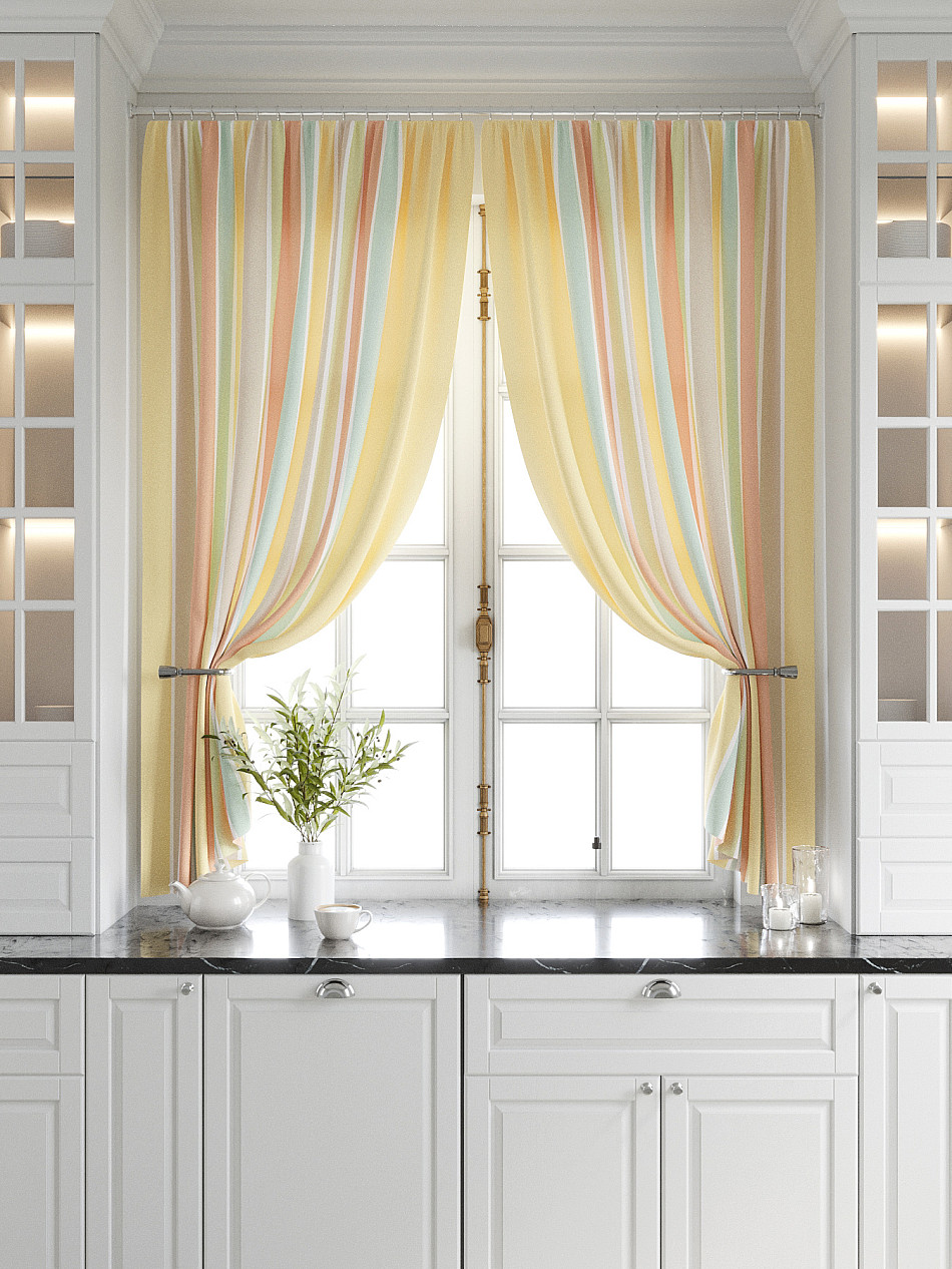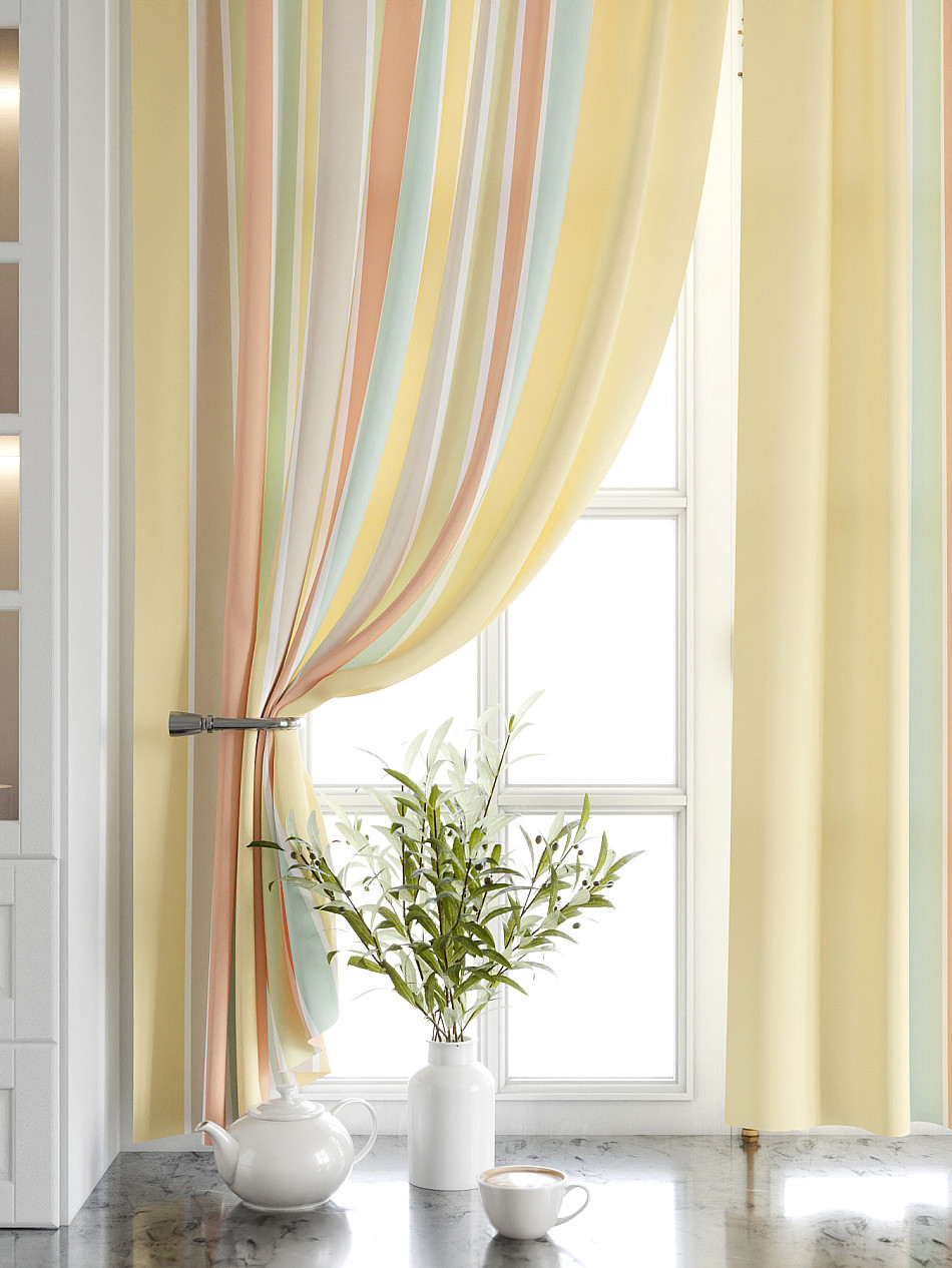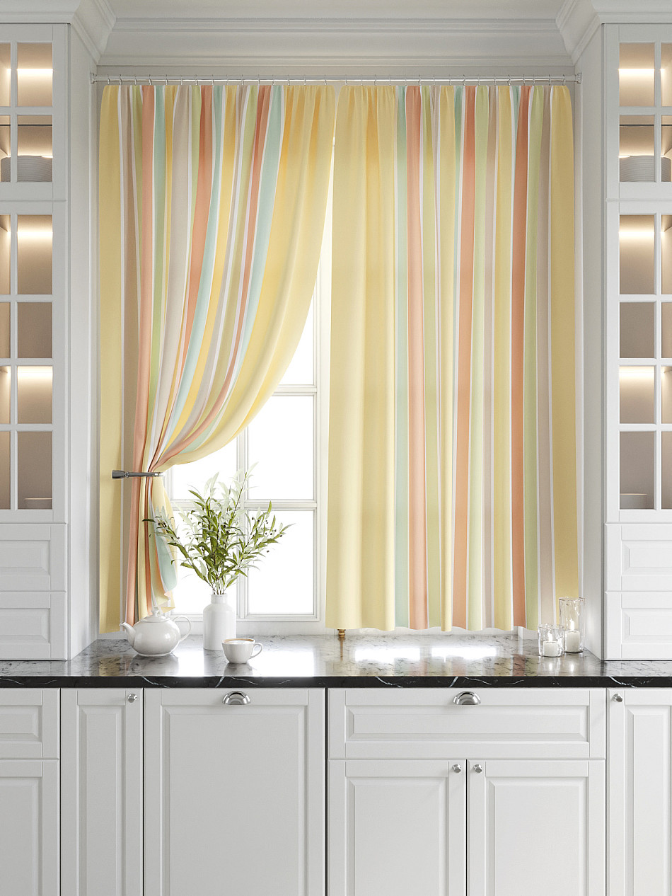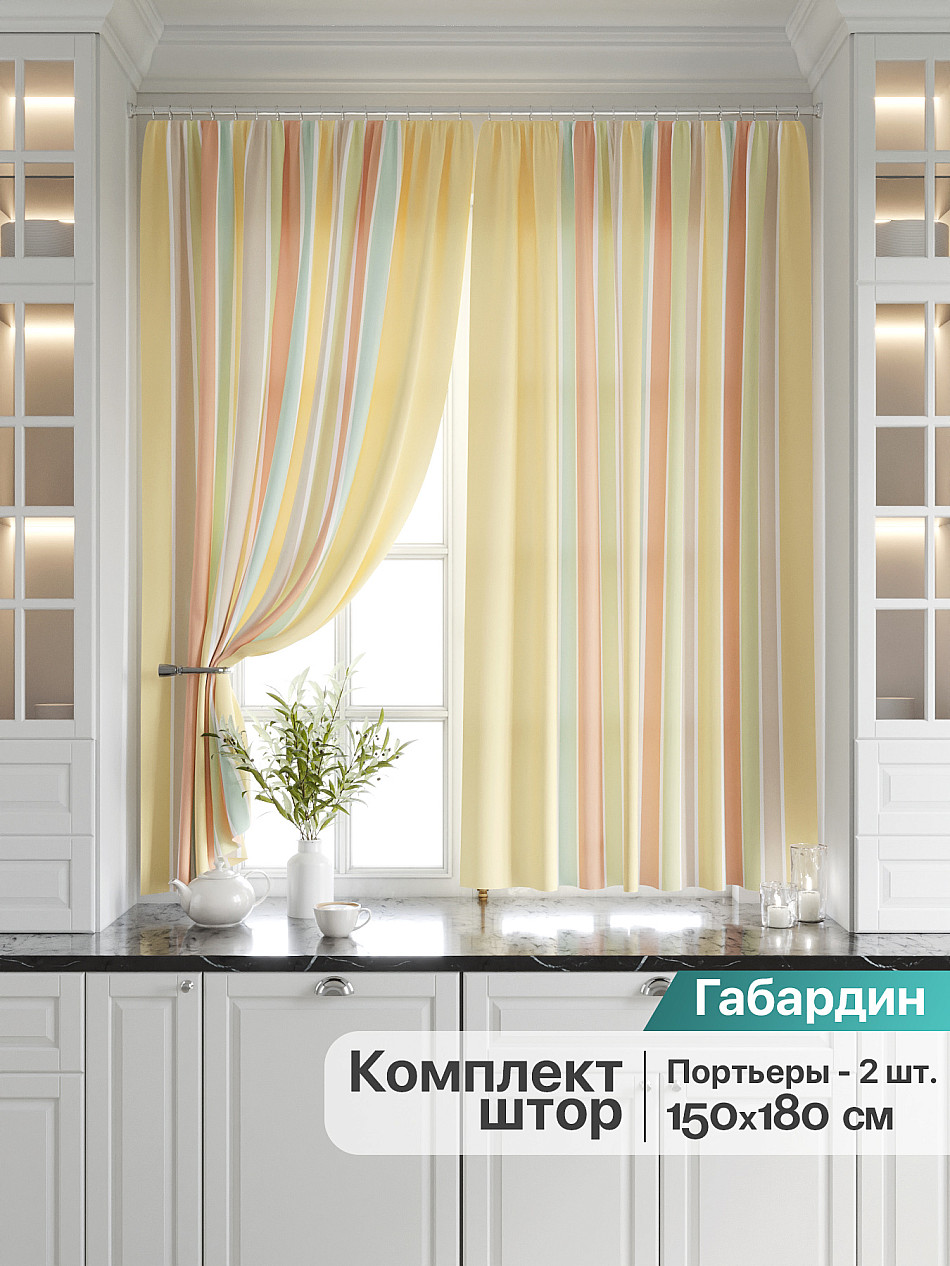 Комплект штор из легкой портьерной ткани (габардин) оформлен печатным рисунком. Печатный рисунок дает широкие возможности обновить интерьер фактически нет требуя ремонта за счет огромного выбора. Ткани с печатным рисунком безопасны и не содержат токсичных веществ. Не смотря на то что, материал легкий, он имеет высокую плотность, мало загрязнятся и не требует особого ухода даже после стирки, что важно для кухонных занавесок. Шторы не выцветают, не растягиваются, превосходно драпируются, образуя струящиеся складки. Прекрасное решение для создания красоты и уюта с помощью уникальных дизайнов.