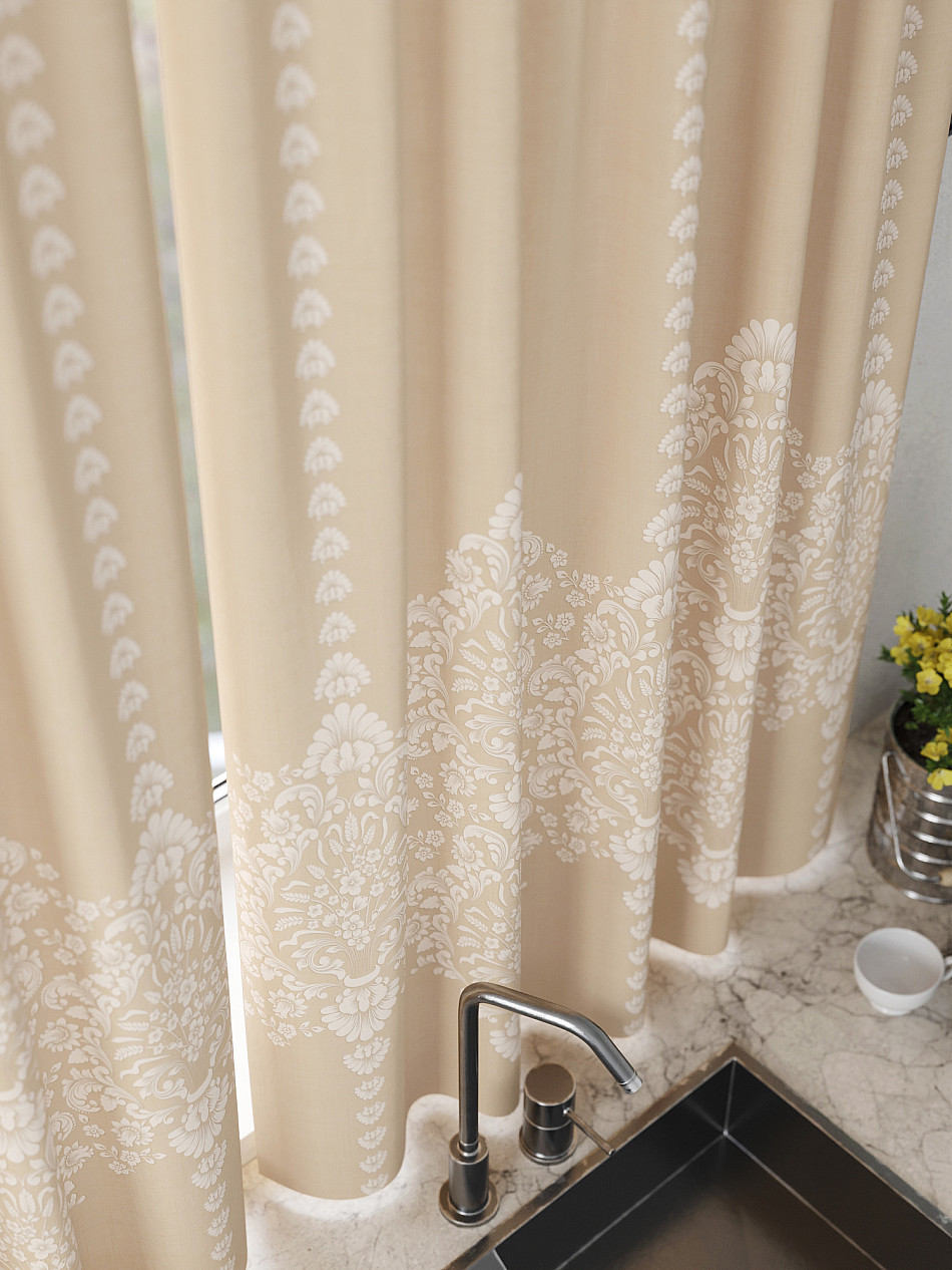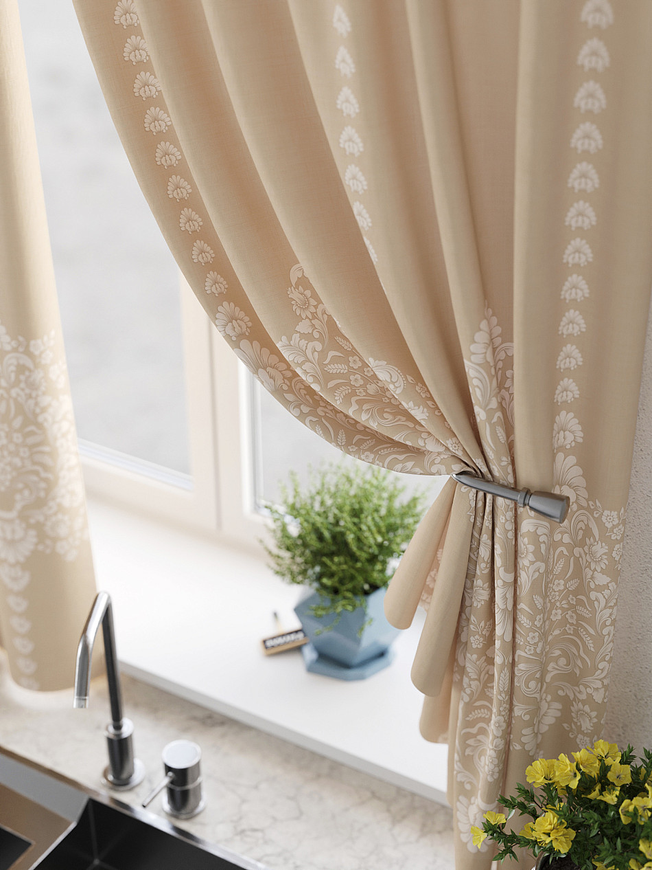 Портьеры 2 шт: Комплект штор из легкой портьерной ткани (габардин) оформлен печатным рисунком. Печатный рисунок дает широкие возможности обновить интерьер фактически нет требуя ремонта за счет огромного выбора. Ткани с печатным рисунком безопасны и не содержат токсичных веществ. Не смотря на то что, материал легкий, он имеет высокую плотность, мало загрязнятся и не требует особого ухода даже после стирки, что важно для кухонных занавесок. Шторы не выцветают, не растягиваются, превосходно драпируются, образуя струящиеся складки. Прекрасное решение для создания красоты и уюта с помощью уникальных дизайнов.