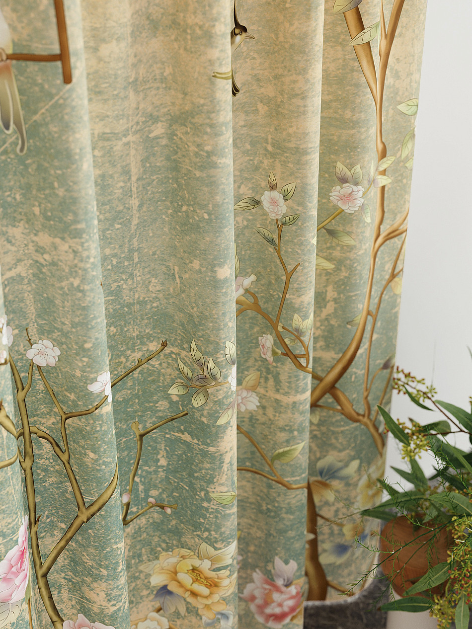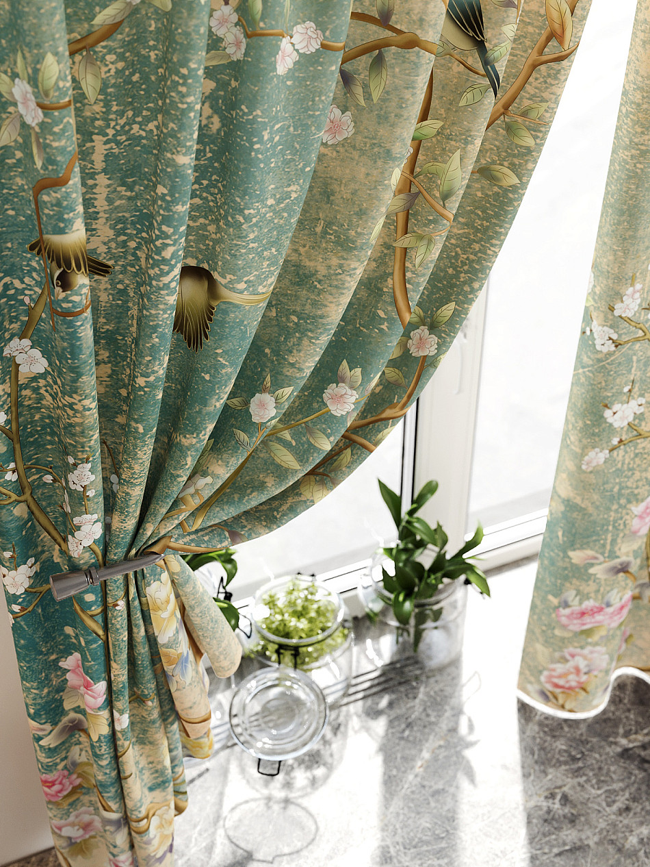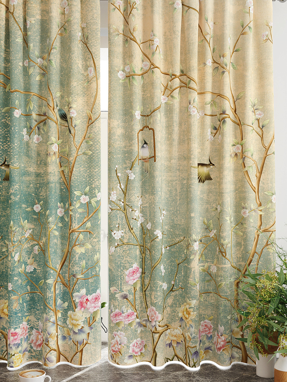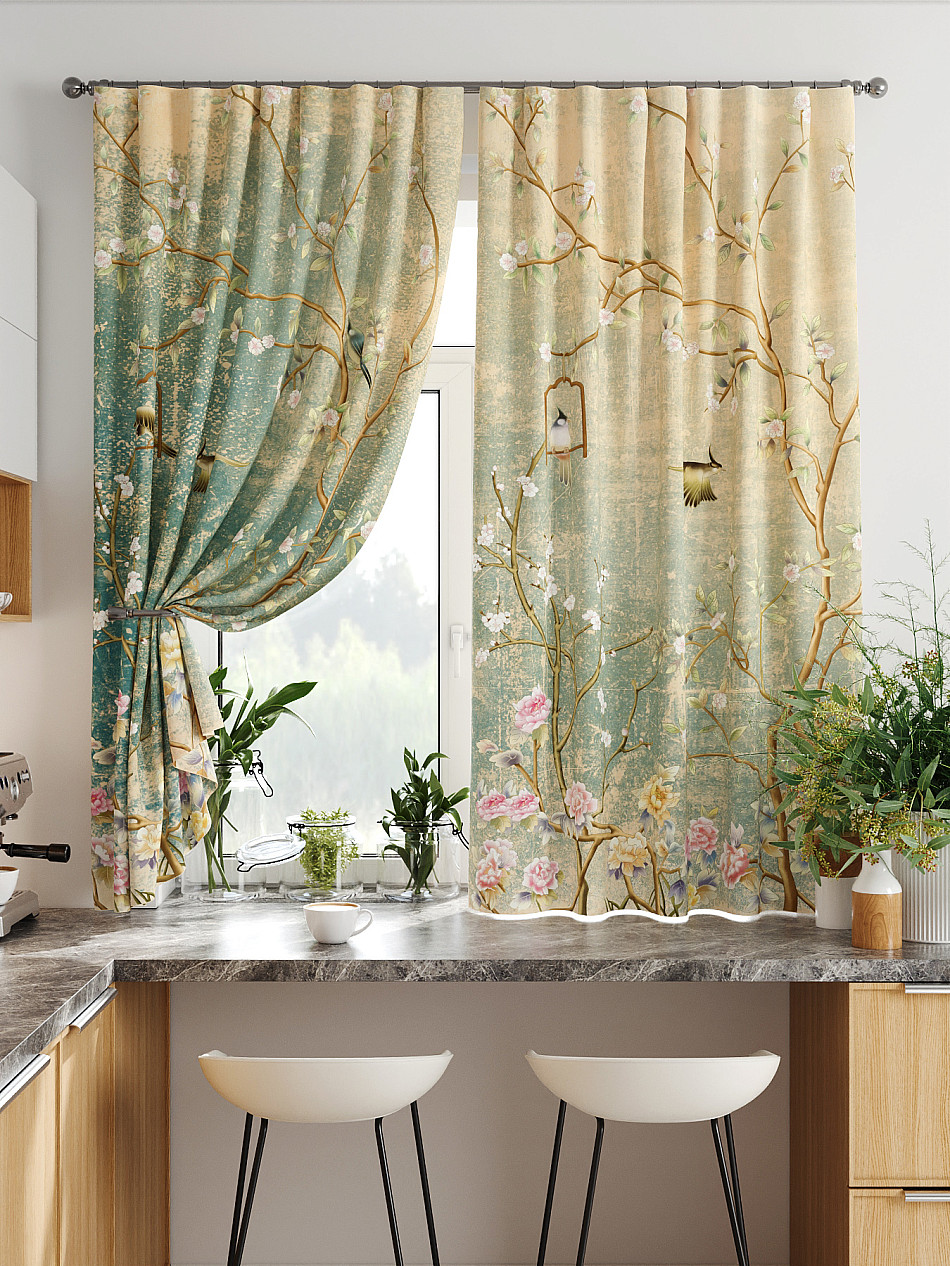Комплект штор из легкой портьерной ткани (габардин) оформлен печатным рисунком. Печатный рисунок дает широкие возможности обновить интерьер фактически нет требуя ремонта за счет огромного выбора. Ткани с печатным рисунком безопасны и не содержат токсичных веществ. Не смотря на то что, материал легкий, он имеет высокую плотность, мало загрязнятся и не требует особого ухода даже после стирки, что важно для кухонных занавесок. Шторы не выцветают, не растягиваются, превосходно драпируются, образуя струящиеся складки. Прекрасное решение для создания красоты и уюта с помощью уникальных дизайнов.
