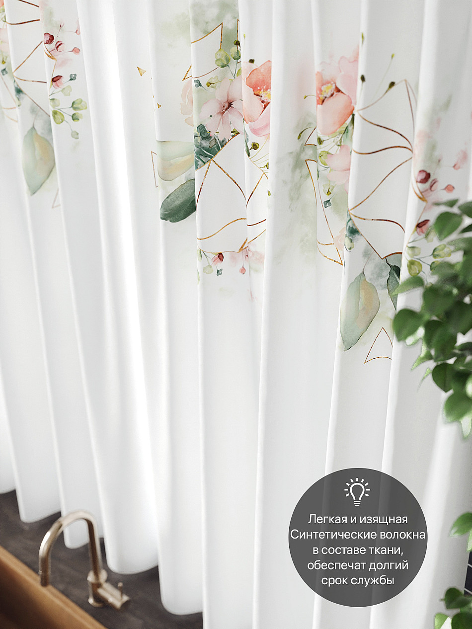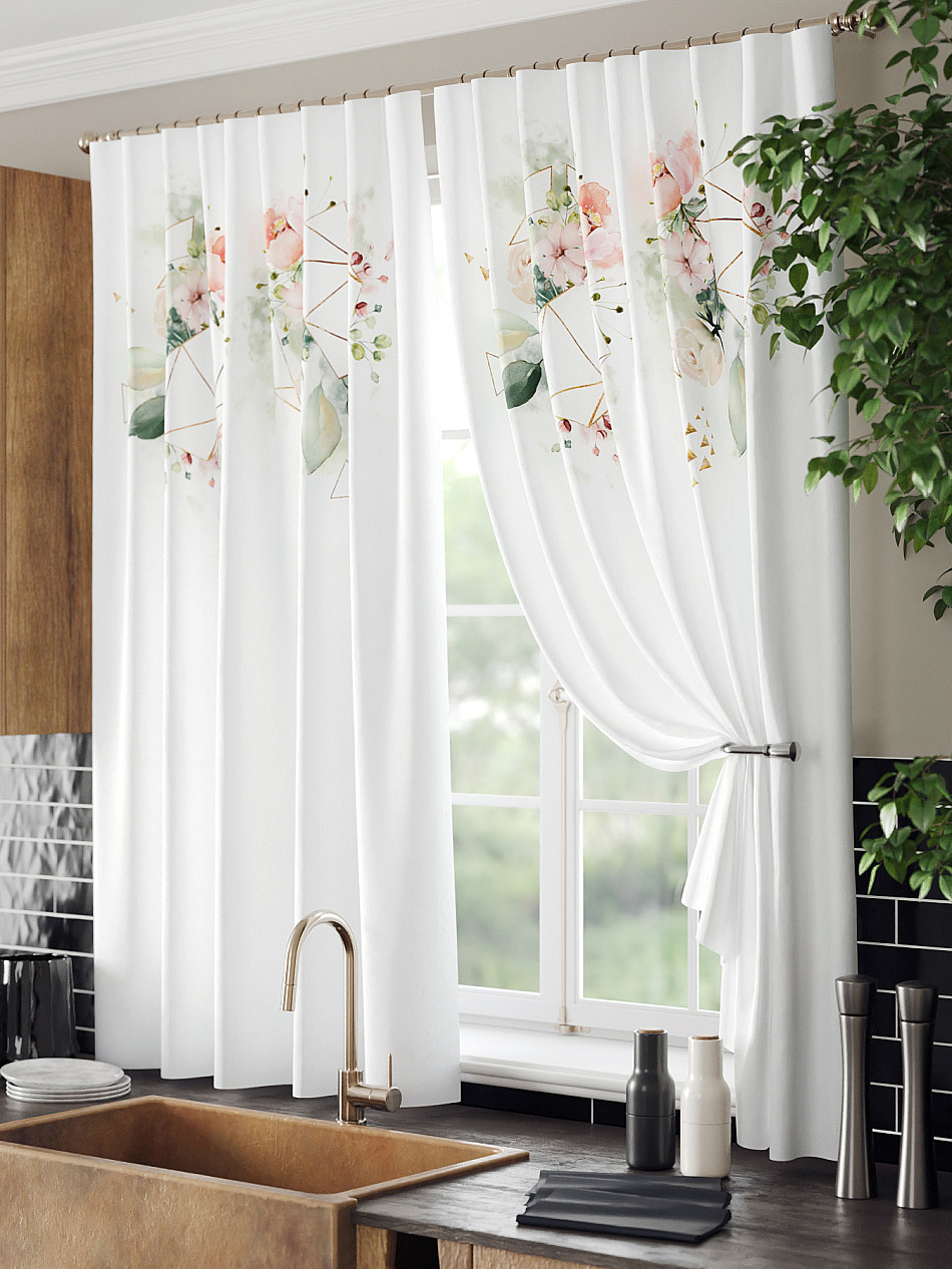 Комплект штор из легкой портьерной ткани (габардин) оформлен печатным рисунком. Печатный рисунок дает широкие возможности обновить интерьер фактически нет требуя ремонта за счет огромного выбора. Ткани с печатным рисунком безопасны и не содержат токсичных веществ. Не смотря на то что, материал легкий, он имеет высокую плотность, мало загрязнятся и не требует особого ухода даже после стирки, что важно для кухонных занавесок. Шторы не выцветают, не растягиваются, превосходно драпируются, образуя струящиеся складки. Прекрасное решение для создания красоты и уюта с помощью уникальных дизайнов.