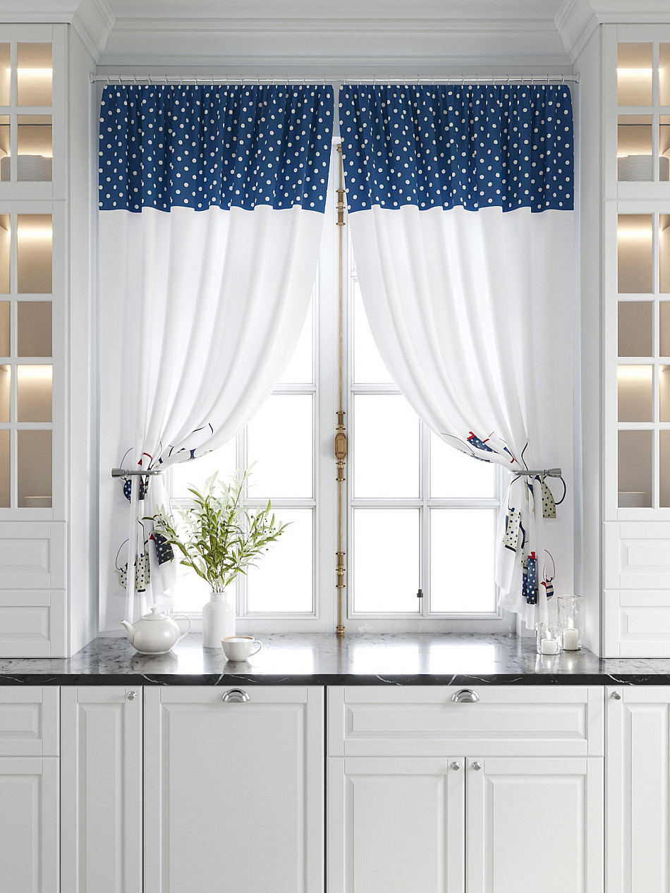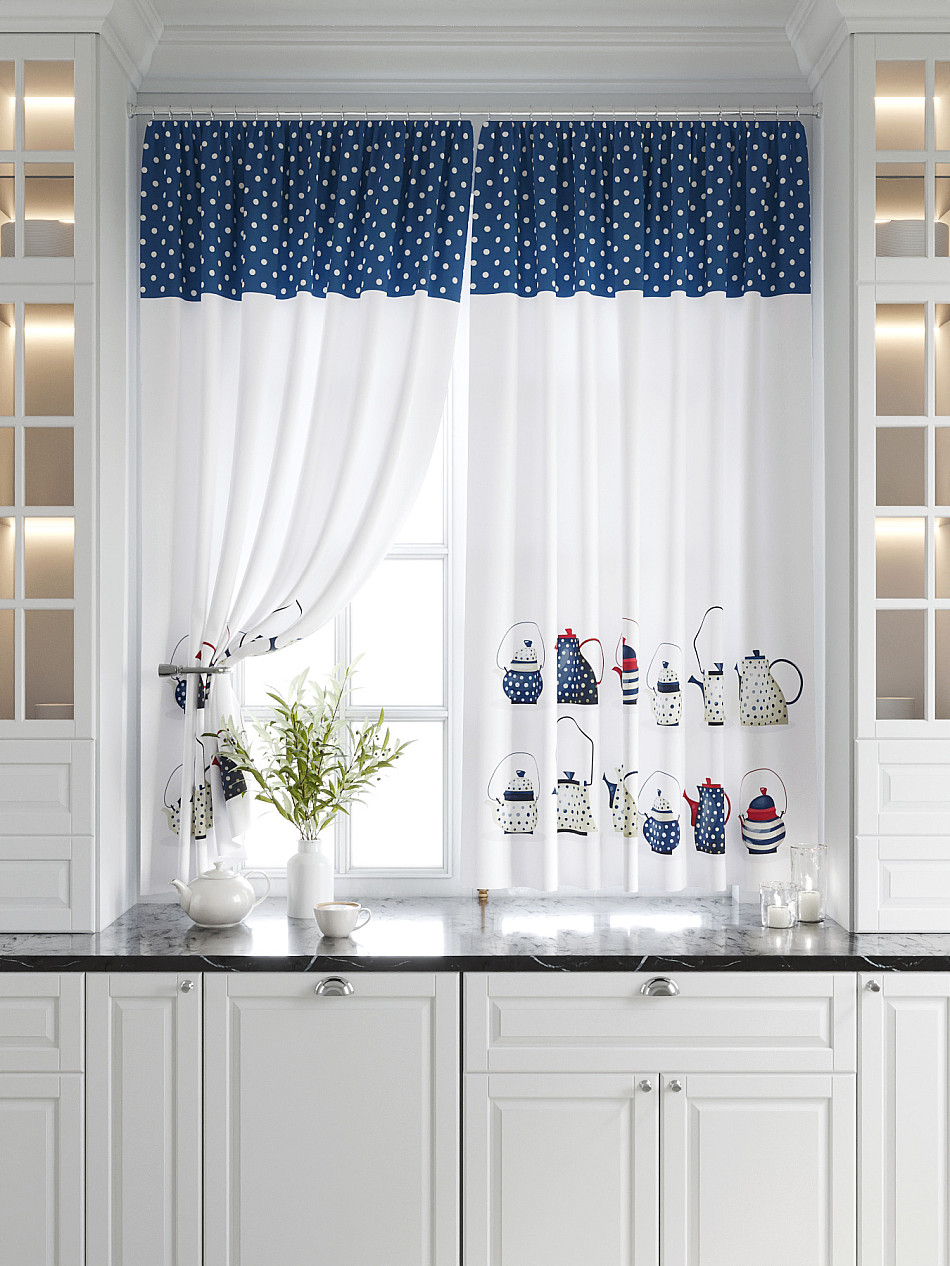 Комплект штор из легкой портьерной ткани (габардин) оформлен печатным рисунком. Печатный рисунок дает широкие возможности обновить интерьер фактически нет требуя ремонта за счет огромного выбора. Ткани с печатным рисунком безопасны и не содержат токсичных веществ. Не смотря на то что, материал легкий, он имеет высокую плотность, мало загрязнятся и не требует особого ухода даже после стирки, что важно для кухонных занавесок. Шторы не выцветают, не растягиваются, превосходно драпируются, образуя струящиеся складки. Прекрасное решение для создания красоты и уюта с помощью уникальных дизайнов.