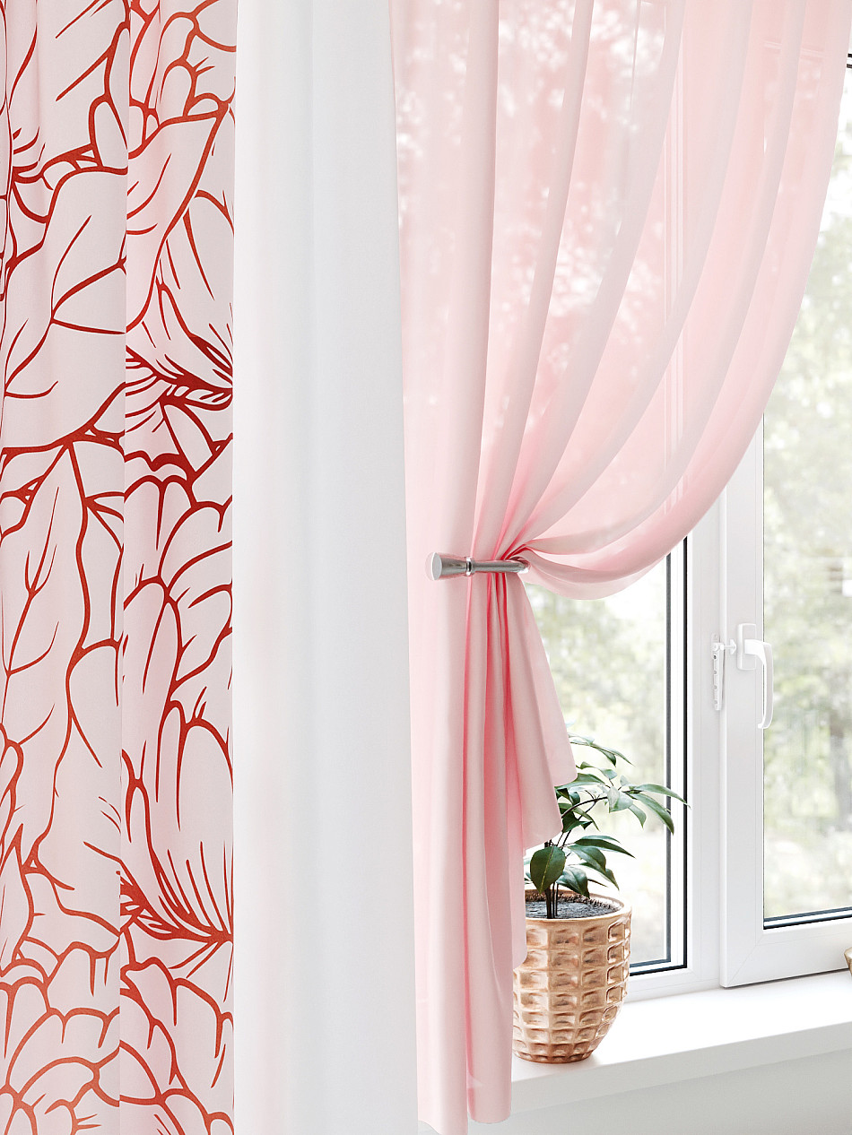 Тюль 2 шт.: Легкая основа (вуаль) оформлена флористическим рисунком. Ширина — 150 см., высота — 180 см., крепление — шторная лента (крючки).